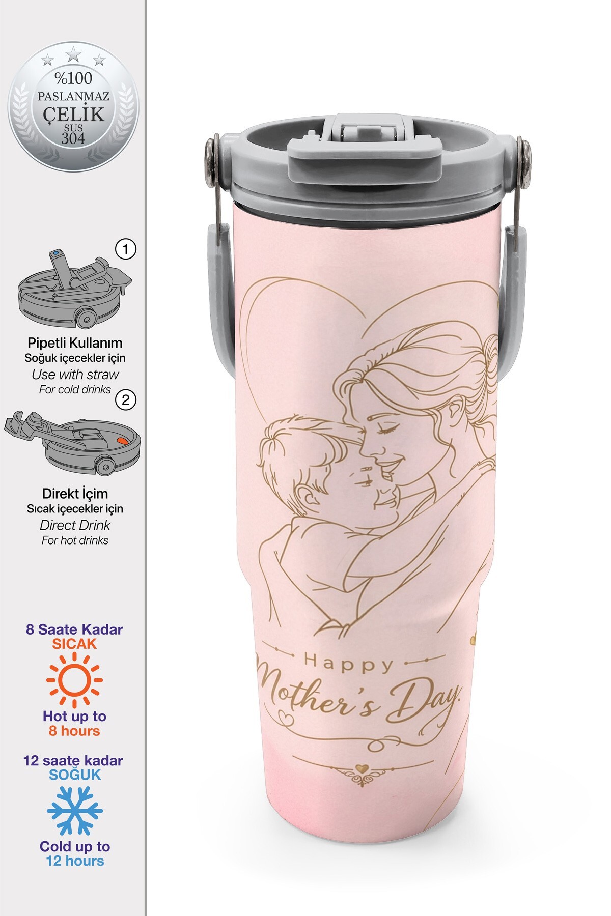 Coral High Anneler Gününe Özel Anne Erkek Çocuk Desenli Pipetli ve Direkt İçim Çelik Termos 900 ml 38764