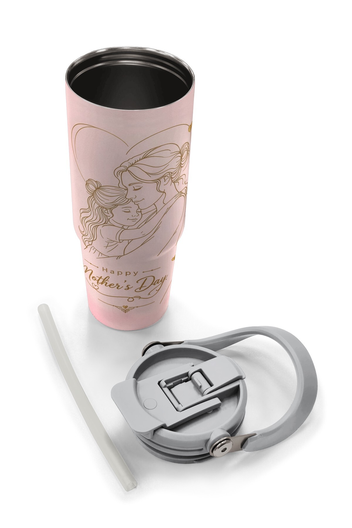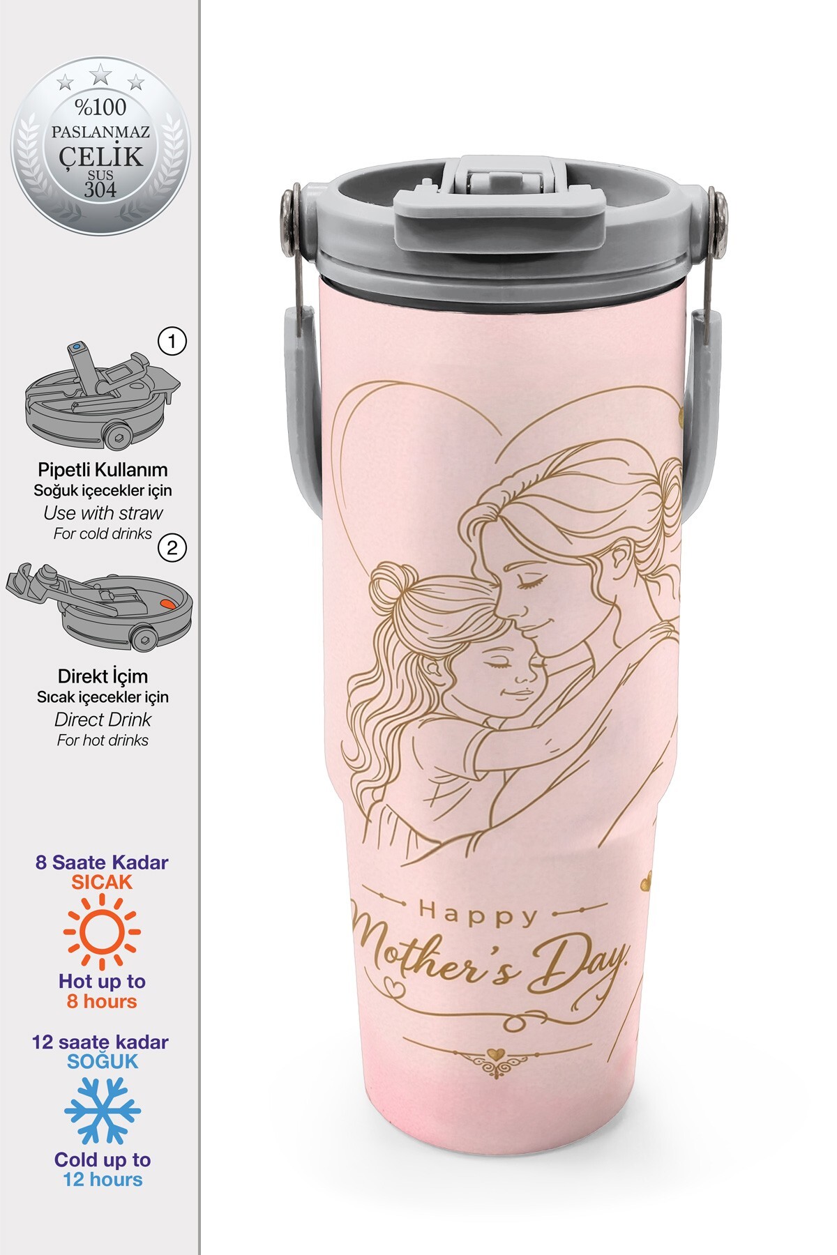 Coral High Anneler Gününe Özel Anne Kız Çocuk Desenli Pipetli ve Direkt İçim Çelik Termos 900 ml 38762