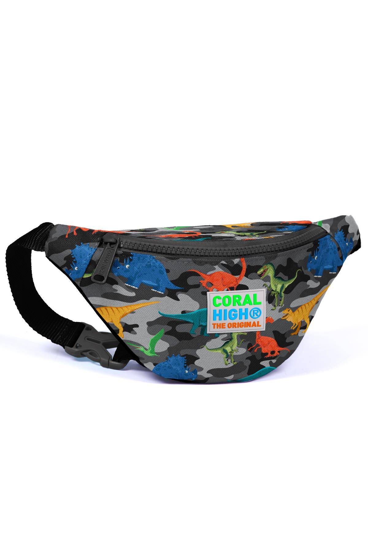Coral High Kids Koyu Gri Siyah Kamuflaj Dinozor Desenli Bel Çantası 22582