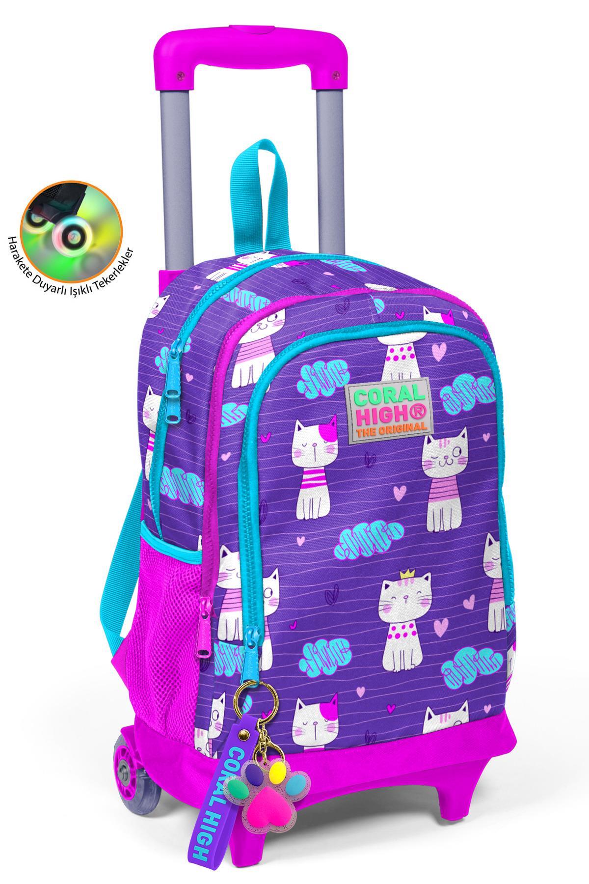 Coral High Kids Mor Pembe Kedi Desenli Üç Bölmeli Çekçekli Okul Sırt Çantası 23360