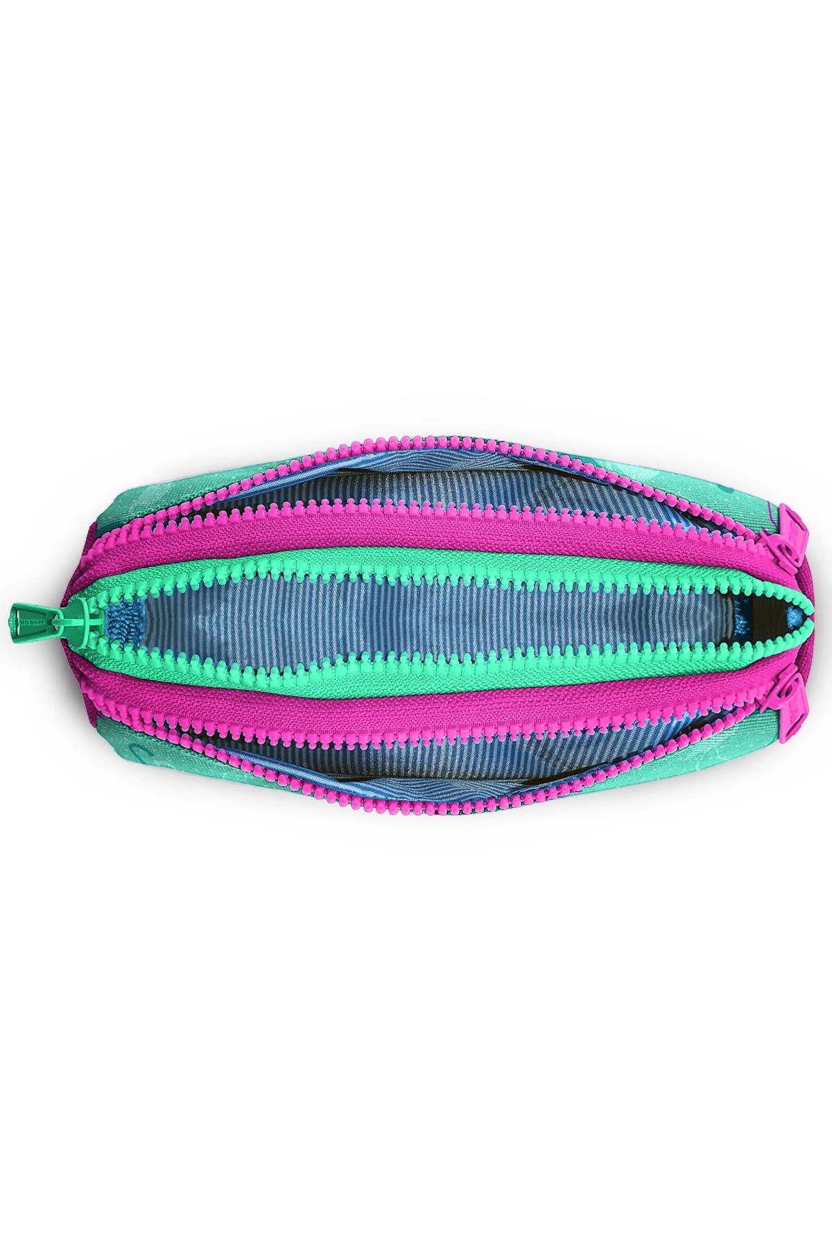 Üç bölmeli, fermuarlı kalem çantası.