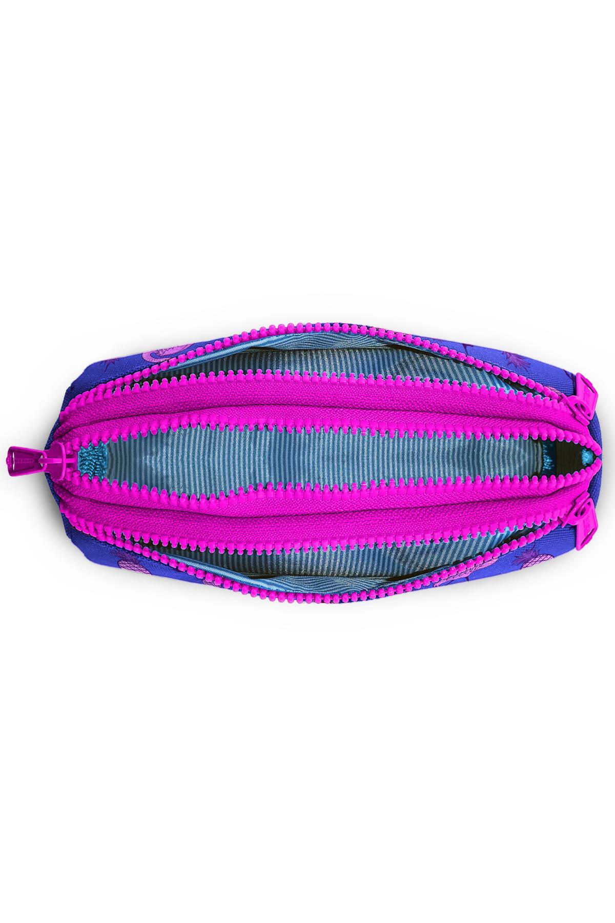 Üç bölmeli, fermuarlı kalem çantası.
