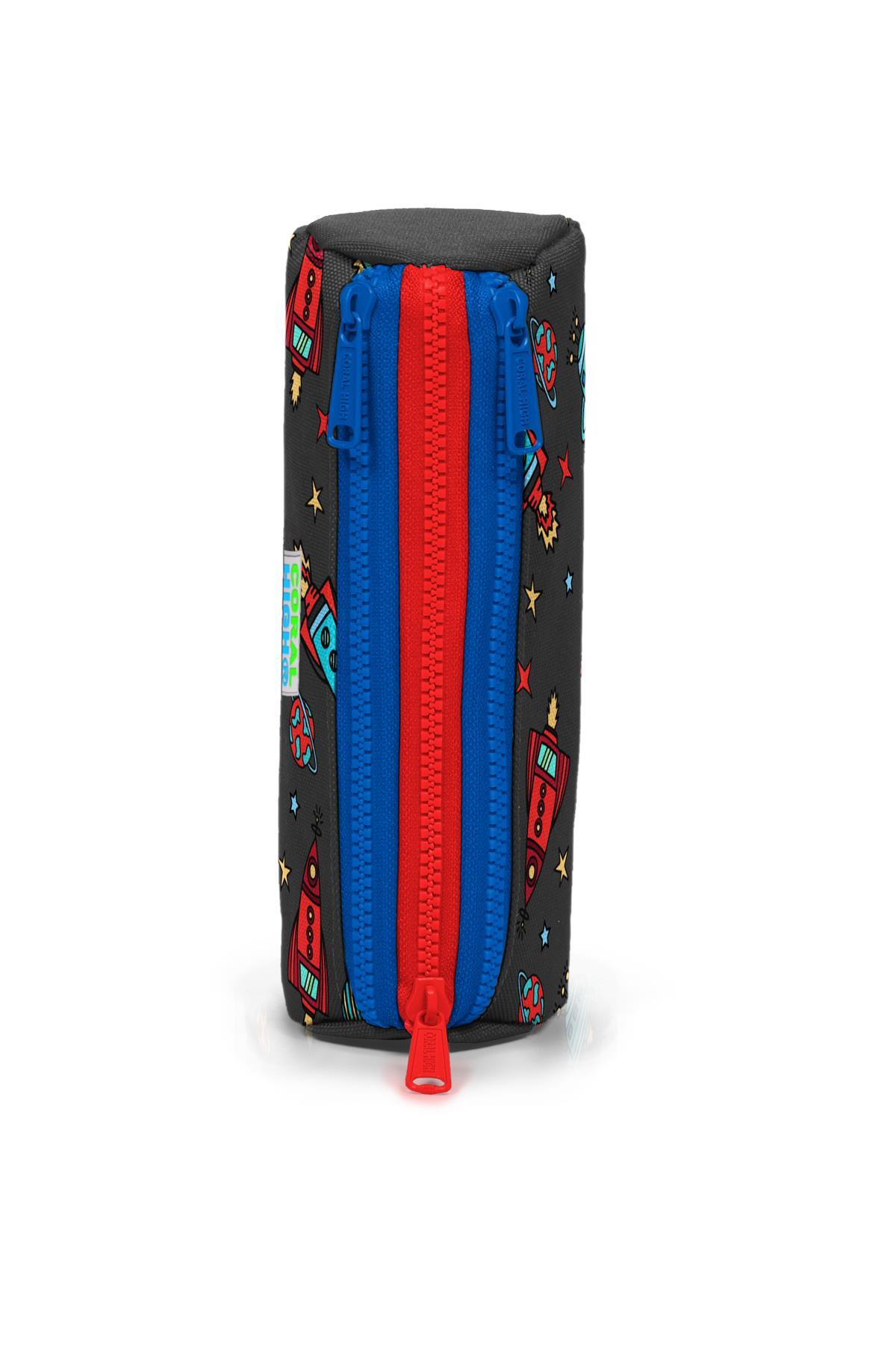 Üç bölmeli, fermuarlı kalem çantası.