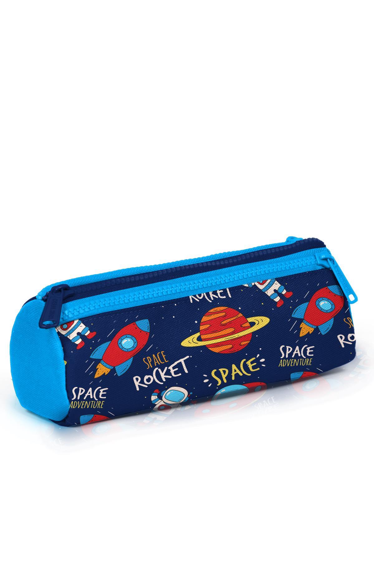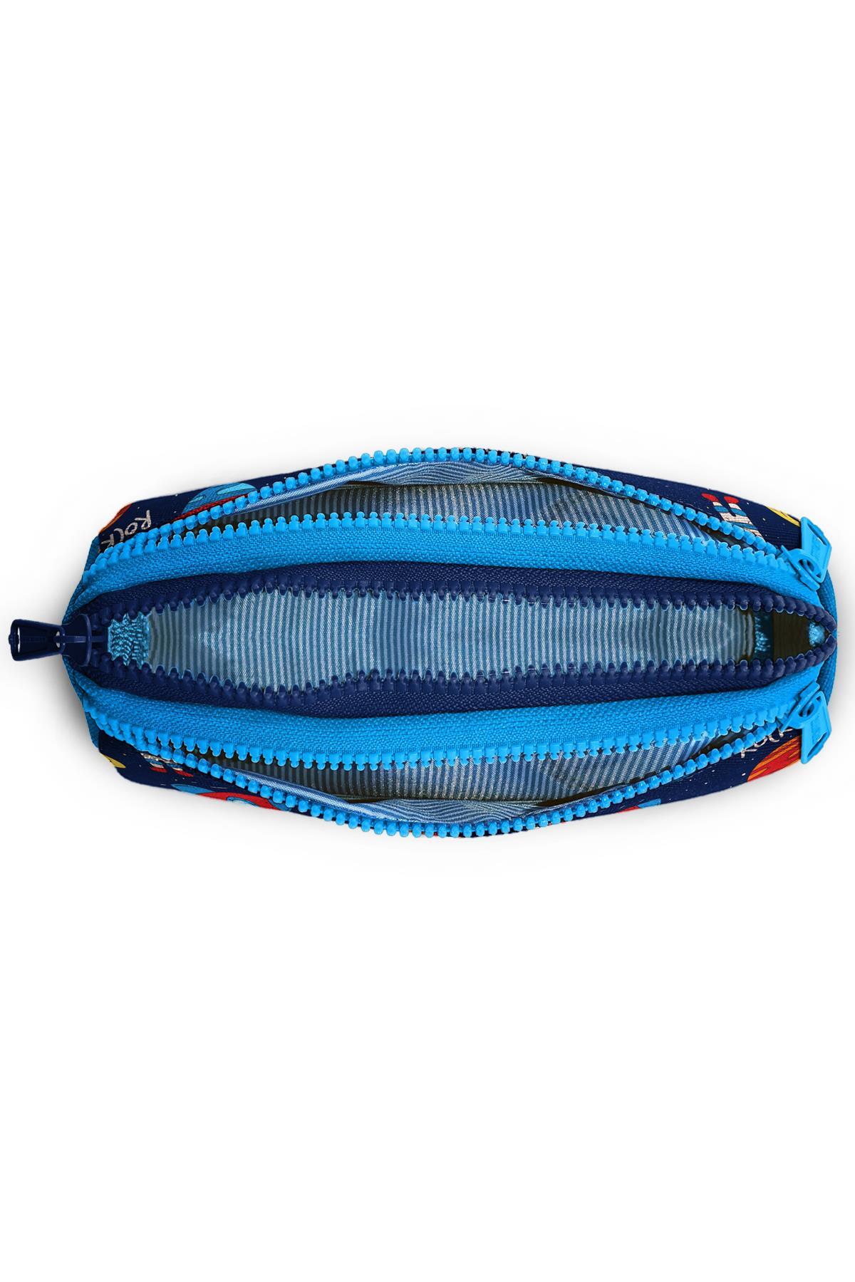 Üç bölmeli, fermuarlı kalem çantası.