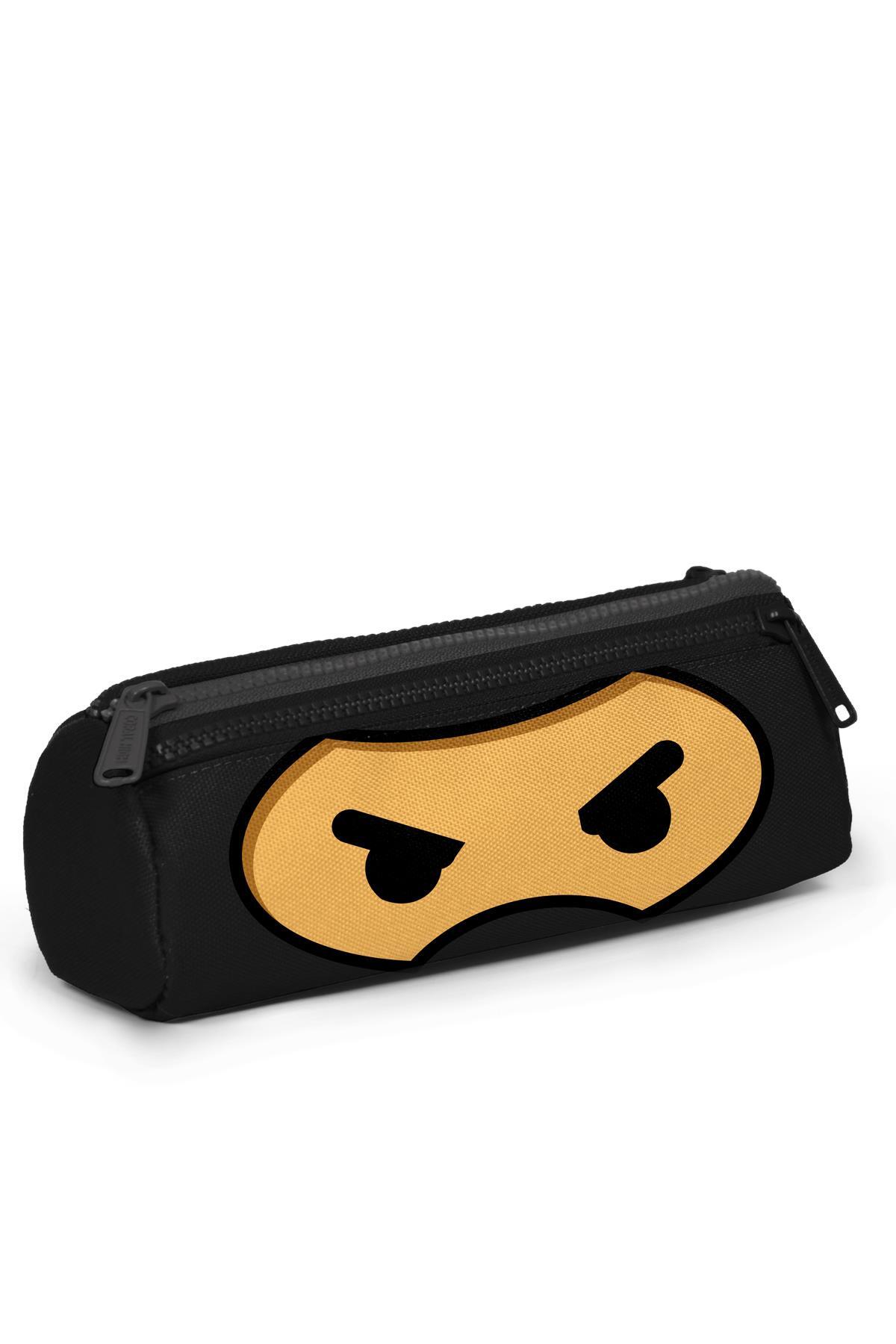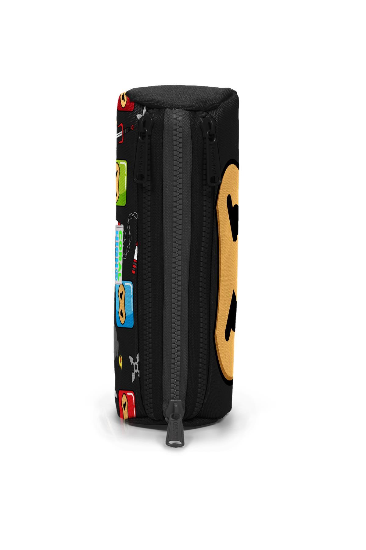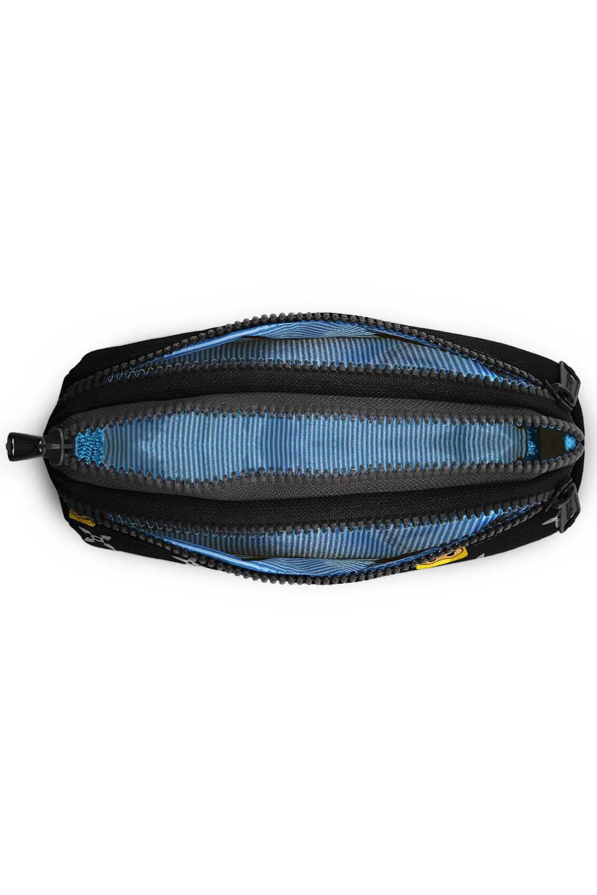 Üç bölmeli, fermuarlı kalem çantası.