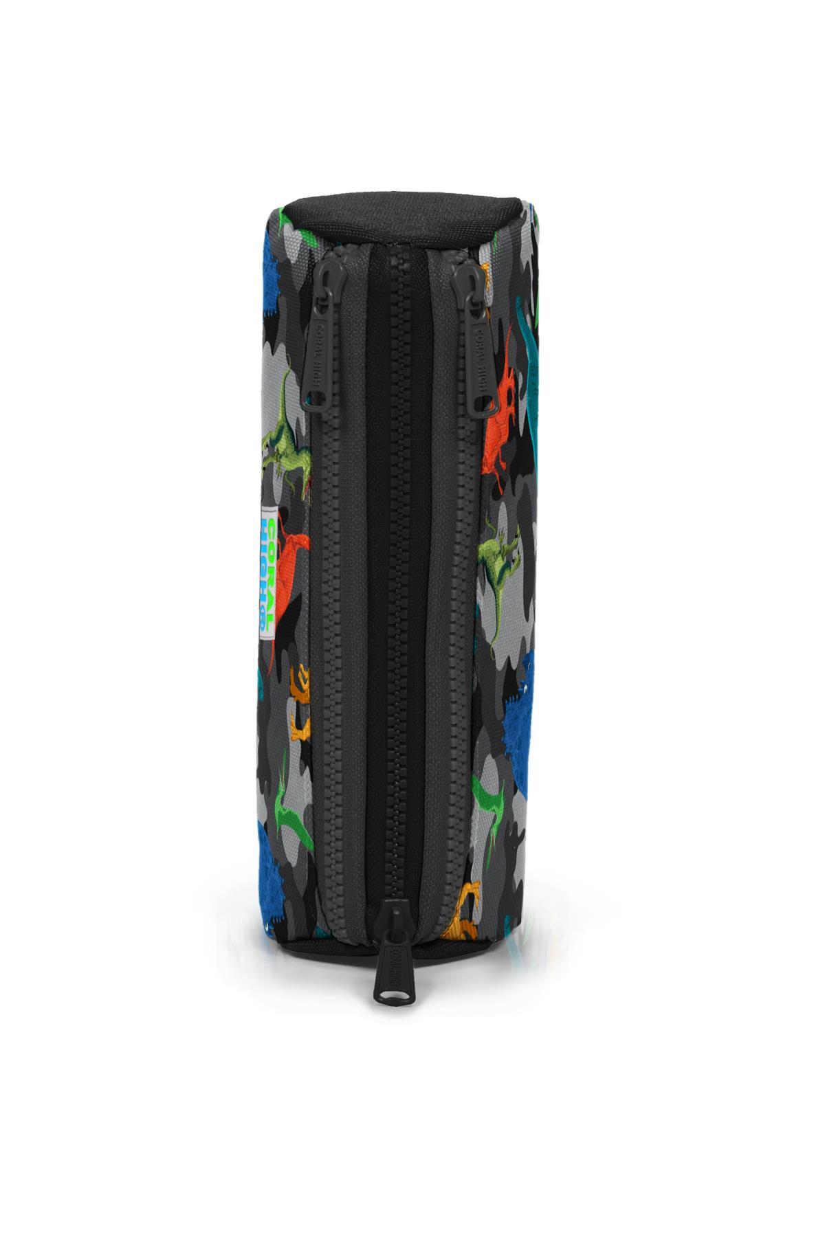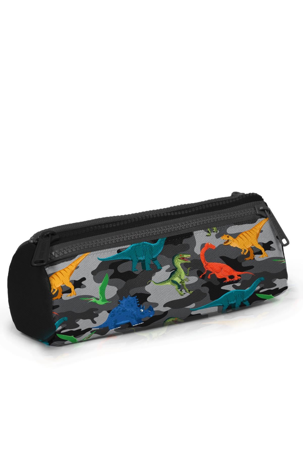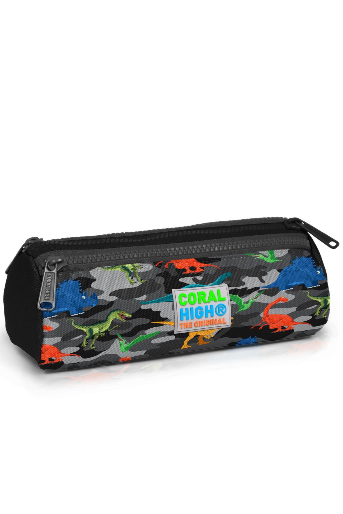 Coral High Kids Koyu Gri Siyah Kamuflaj Dinozor Desenli Üç Bölmeli Kalem Çantası 22326