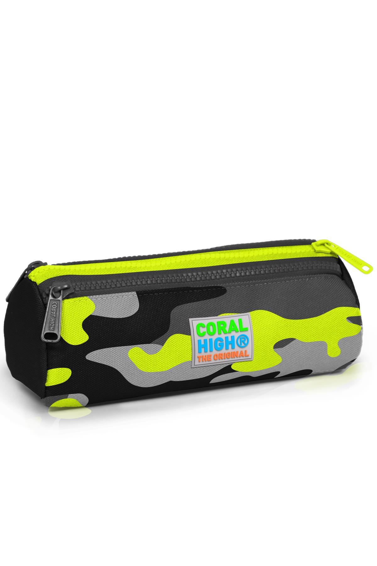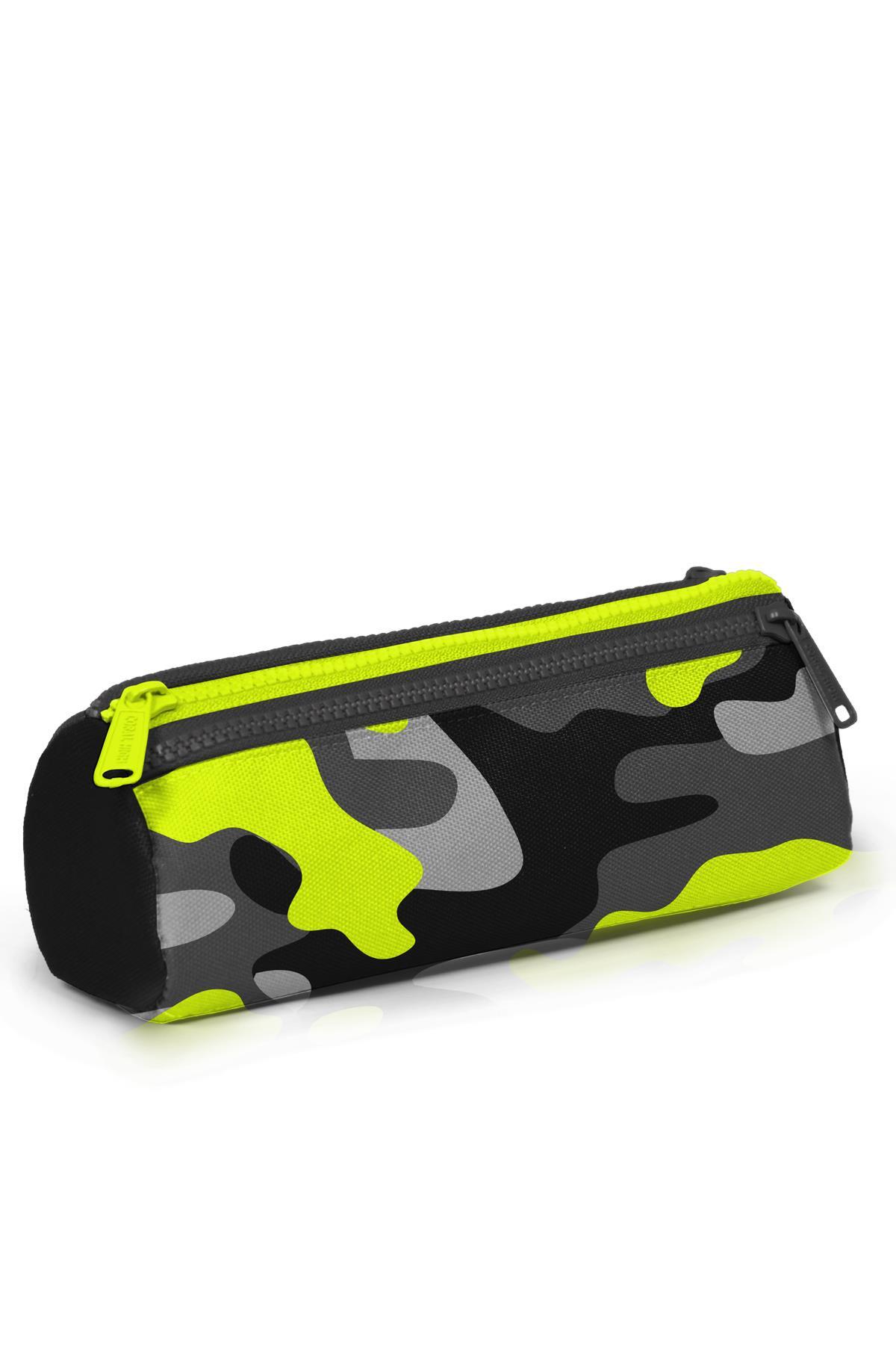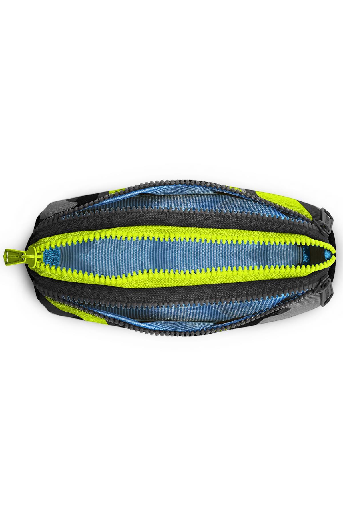 Üç bölmeli, fermuarlı kalem çantası.