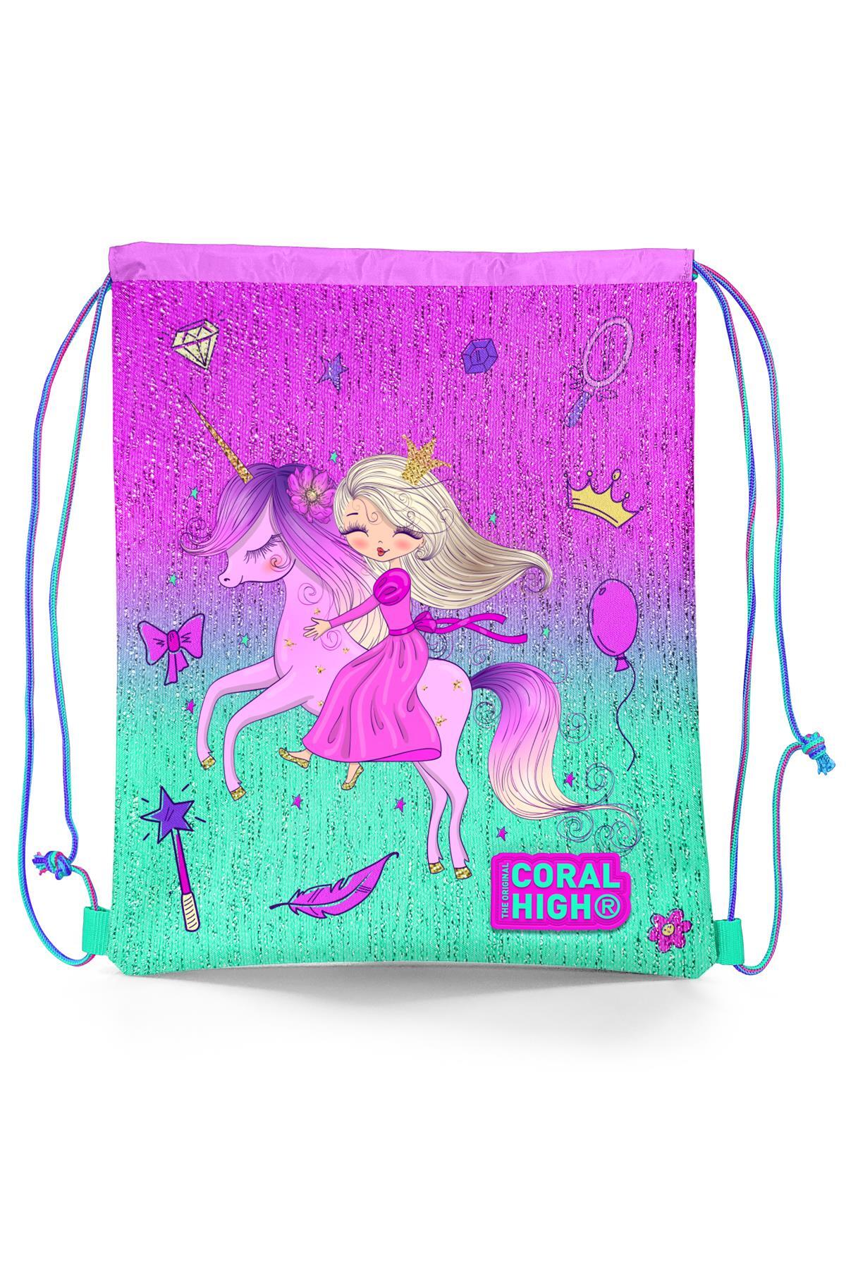 Coral High Kids Açık Pembe Mor Unicornlu Prenses Desenli İpli Büzgülü Sırt Çantası 22686