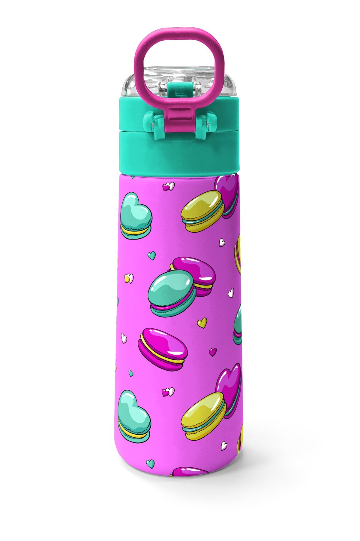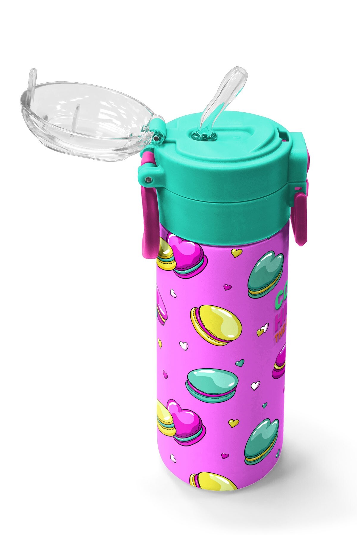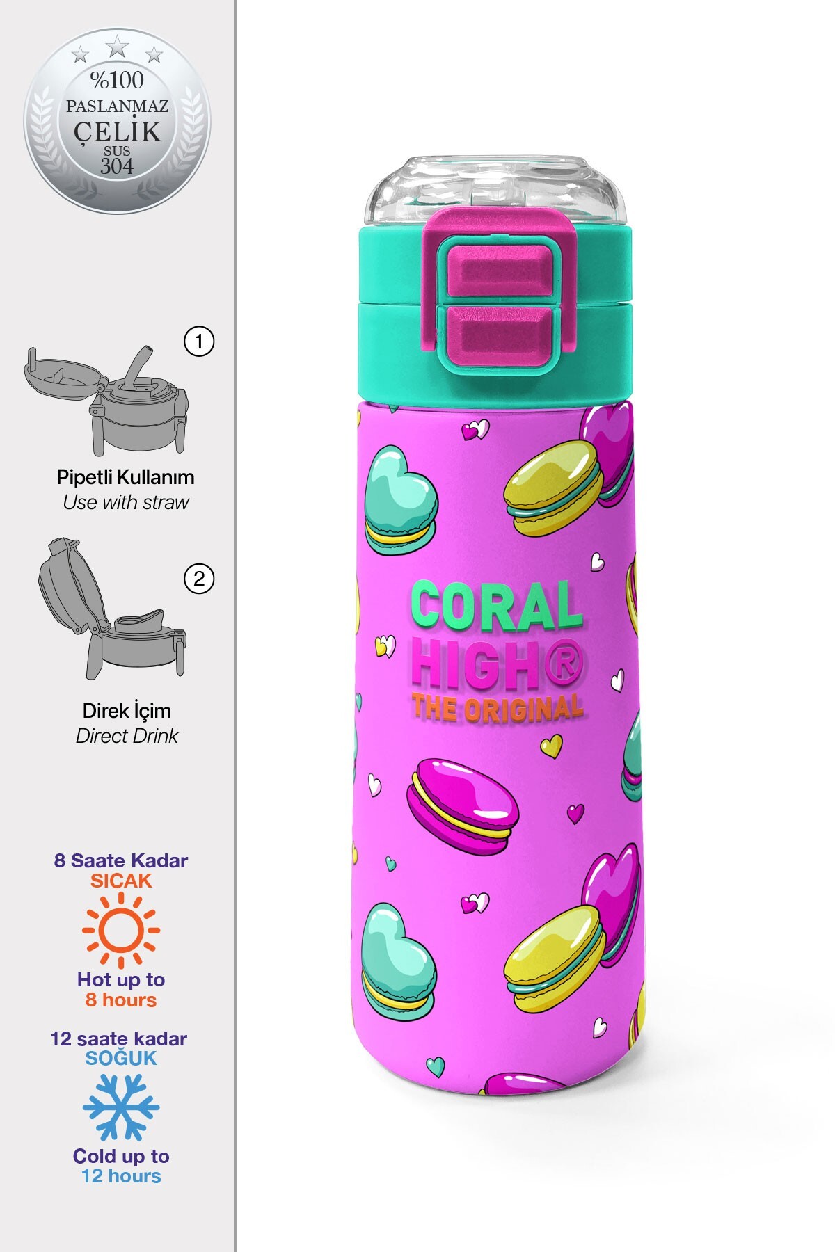 Coral High Kids Açık Pembe Su Yeşili Makaron Desenli Pipetli ve Direkt İçim Çelik Termos 500 ml 31912