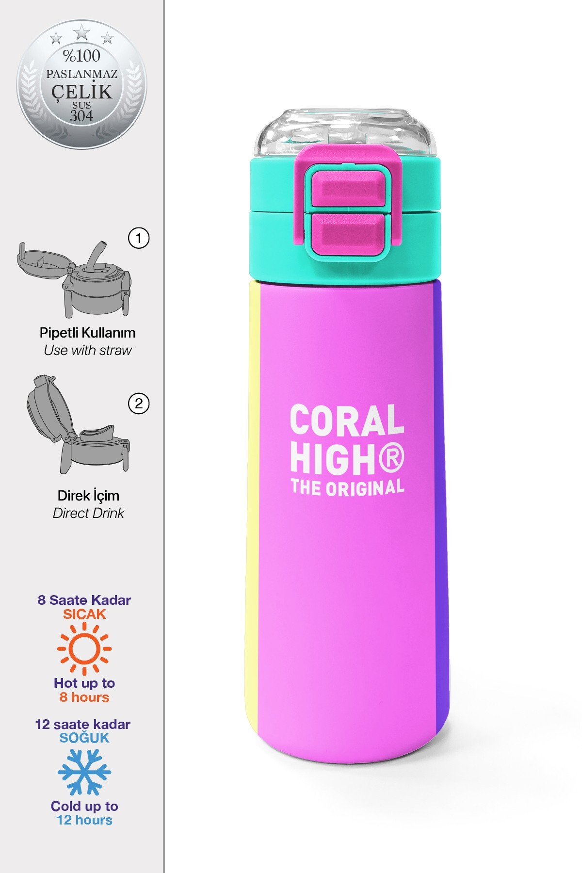 Coral High Kids Renkli Çizgili Desenli Pipetli ve Direkt İçim Çelik Termos 500 ml 31987