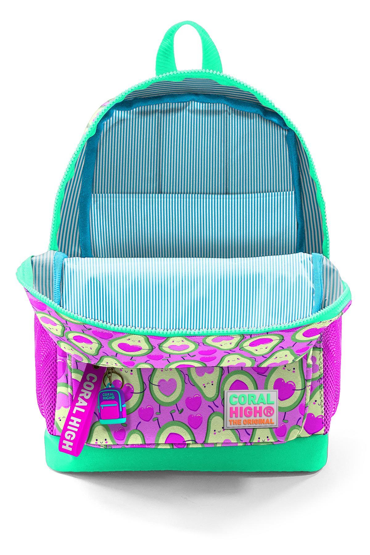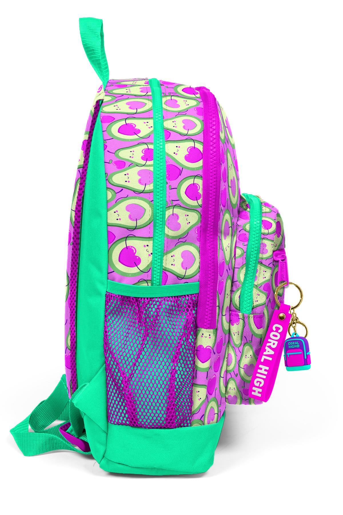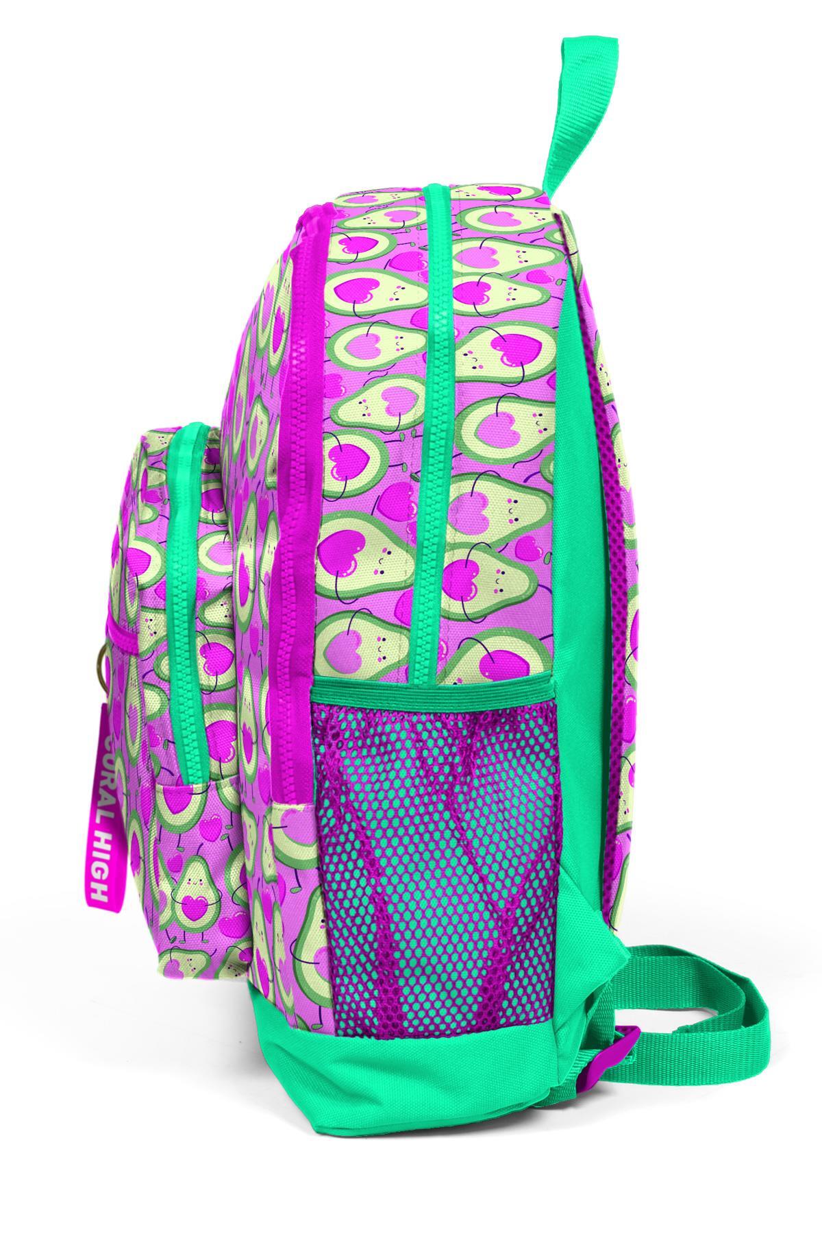 Coral High Kids Açık Pembe Su Yeşili Avokado Desenli Dört Bölmeli Okul Sırt Çantası 23709