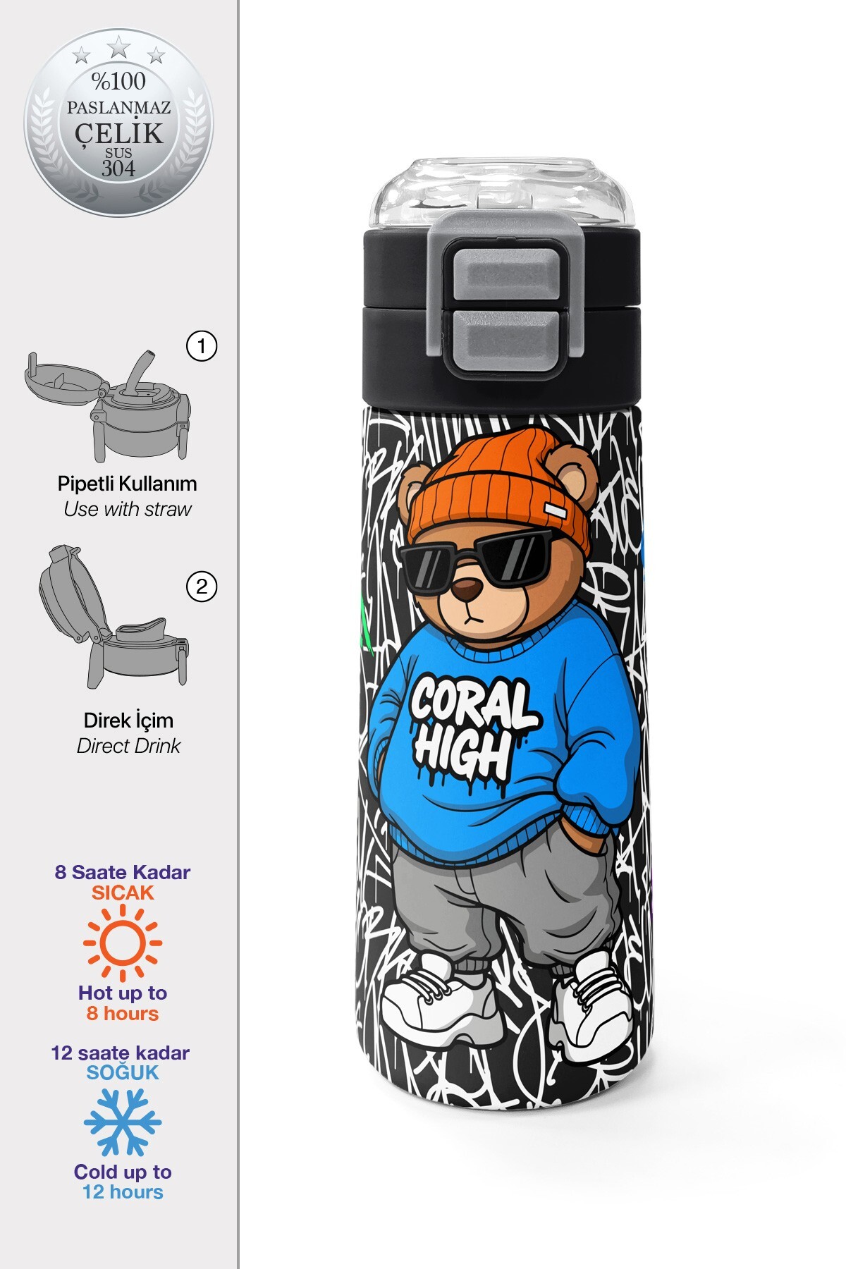 Coral High Kids Grafiti Ayıcık Desenli Pipetli ve Direkt İçim Çelik Termos 500 ml 38132