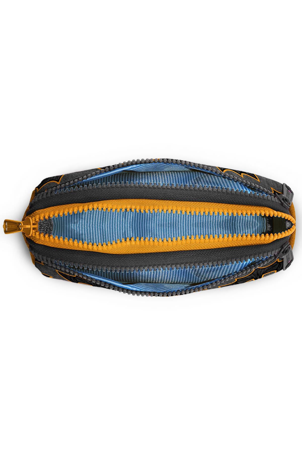 Üç bölmeli, fermuarlı kalem çantası.