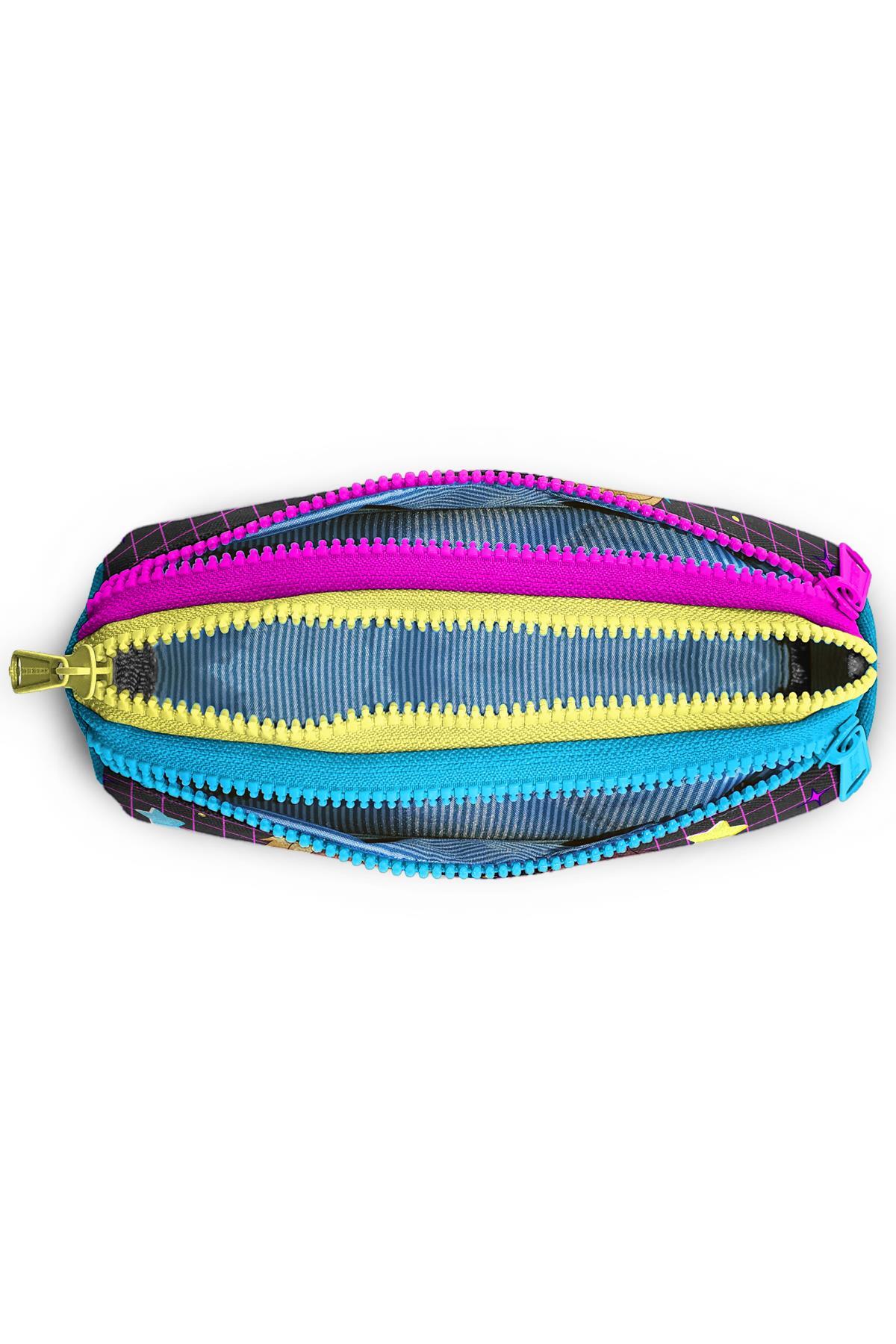 Üç bölmeli, fermuarlı kalem çantası.