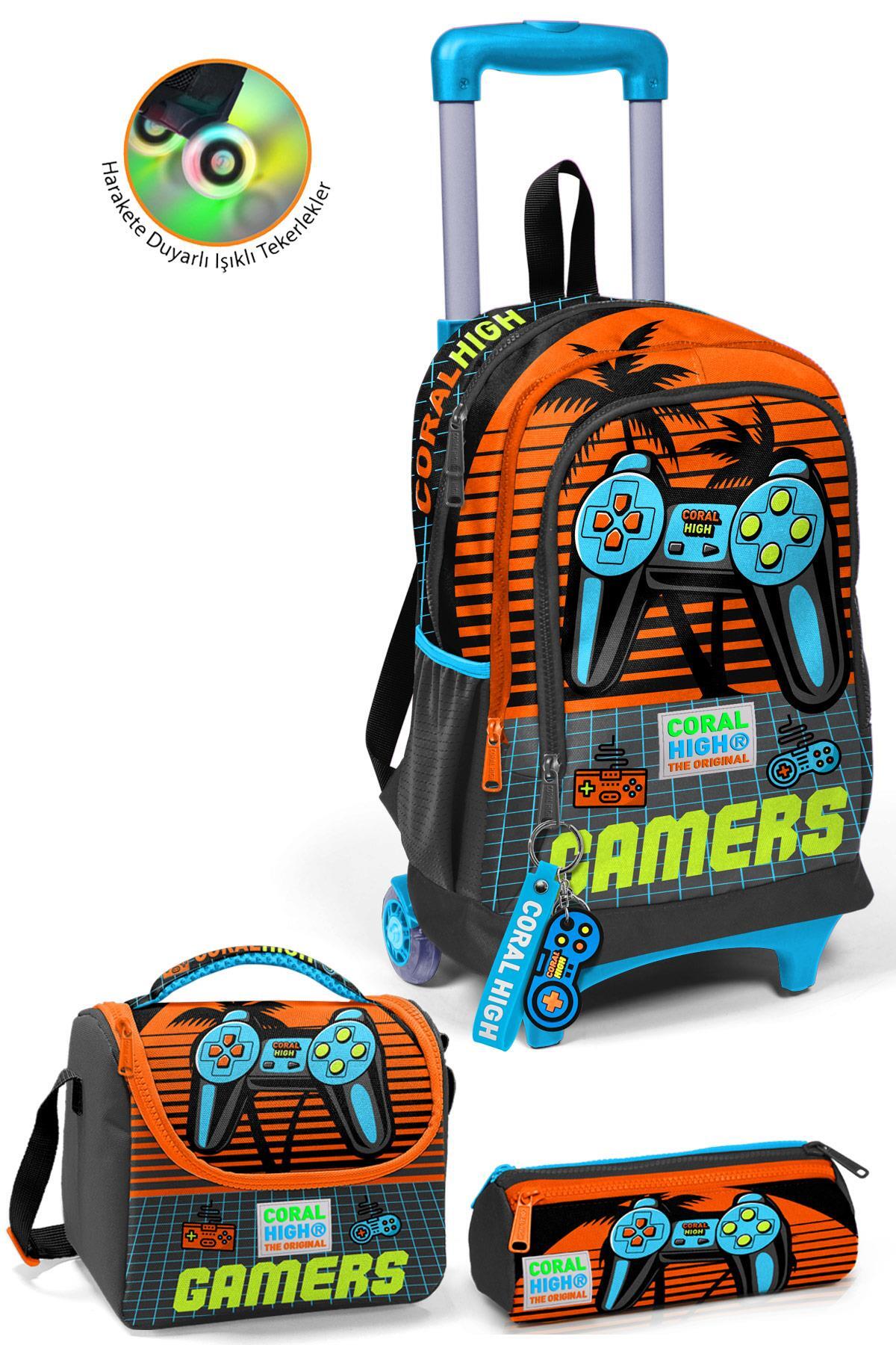 Coral High Kids Gri Turuncu Gamer Desenli Çekçekli 3'lü Çanta Seti SET0123946