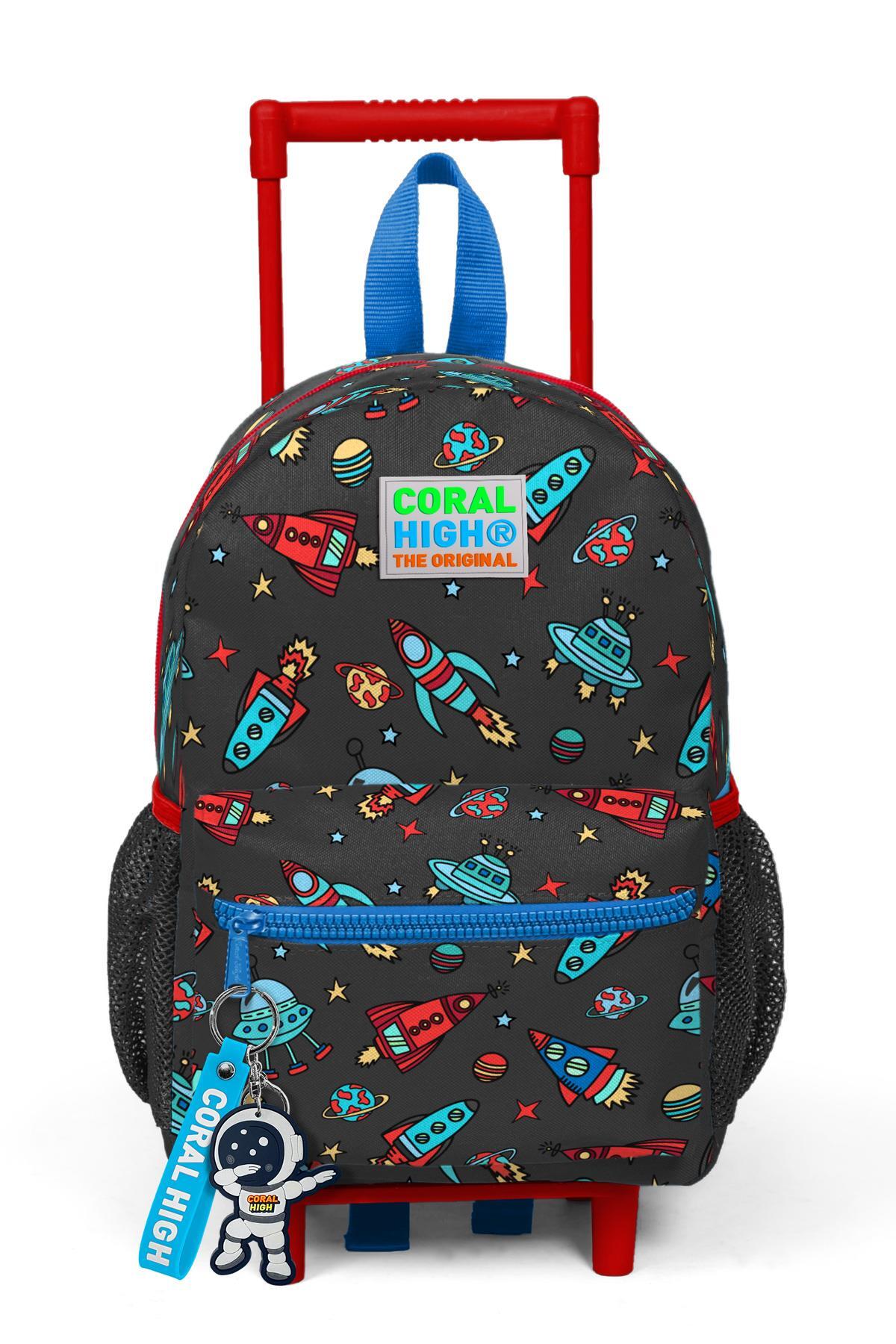 Minik Yuva Çekçekli Sırt Çantası Koyu Gri Kırmızı Uzay Desenli İki Bölmeli 24010