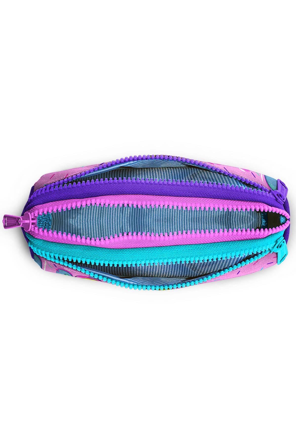 Üç bölmeli, fermuarlı kalem çantası.