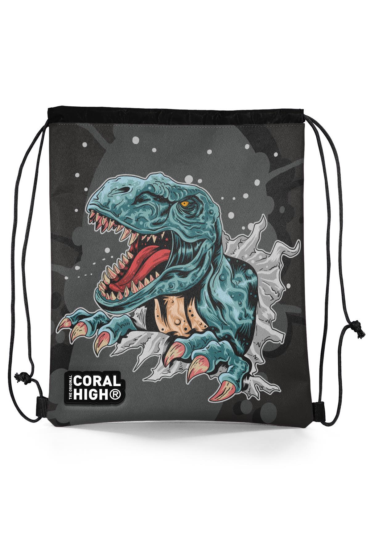 Coral High Kids Koyu Gri Siyah Dinozor Desenli İpli Büzgülü Sırt Çantası 22485