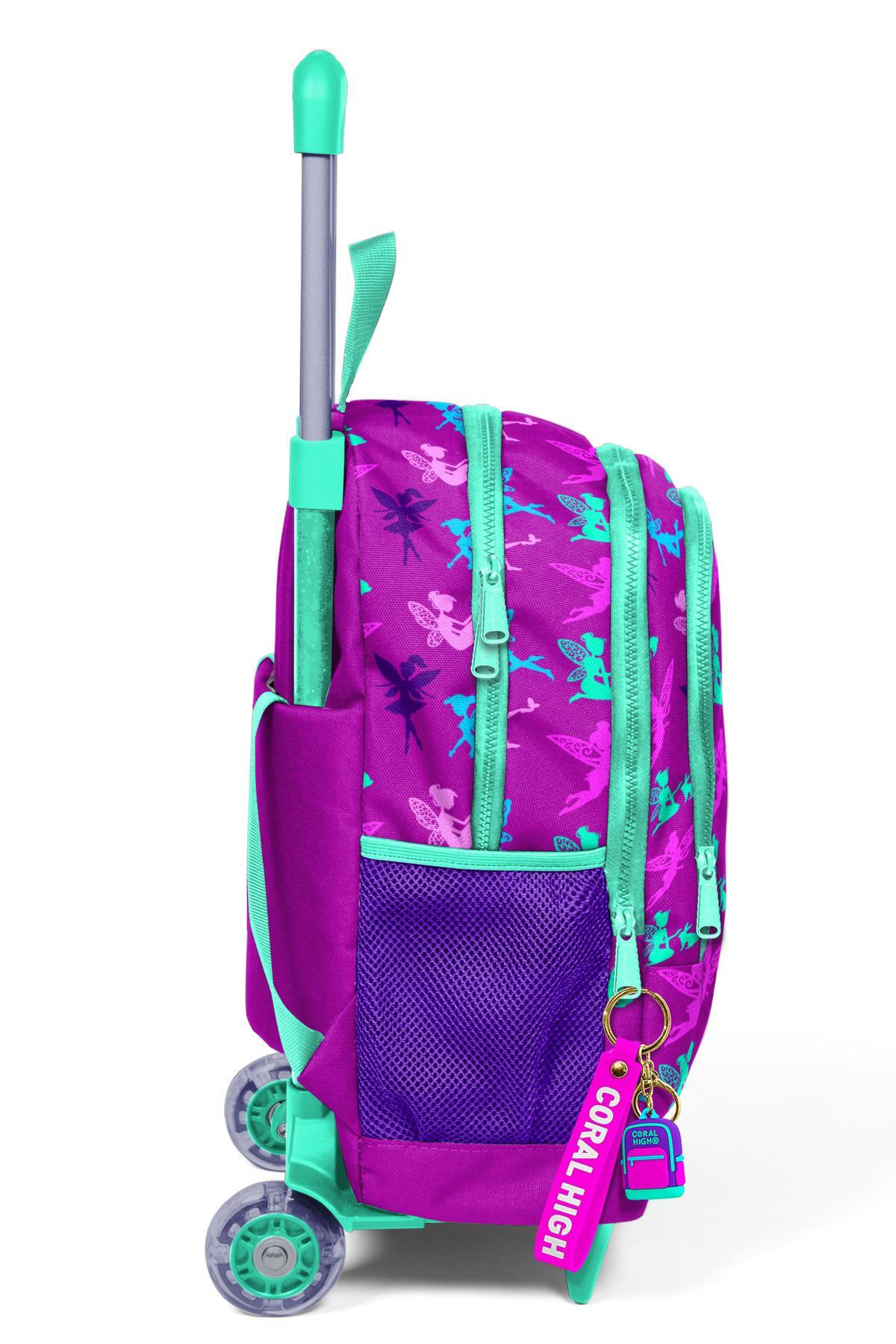 Coral High Kids Koyu Pembe Su Yeşili Peri Desenli Üç Bölmeli Çekçekli Okul Sırt Çantası 23129