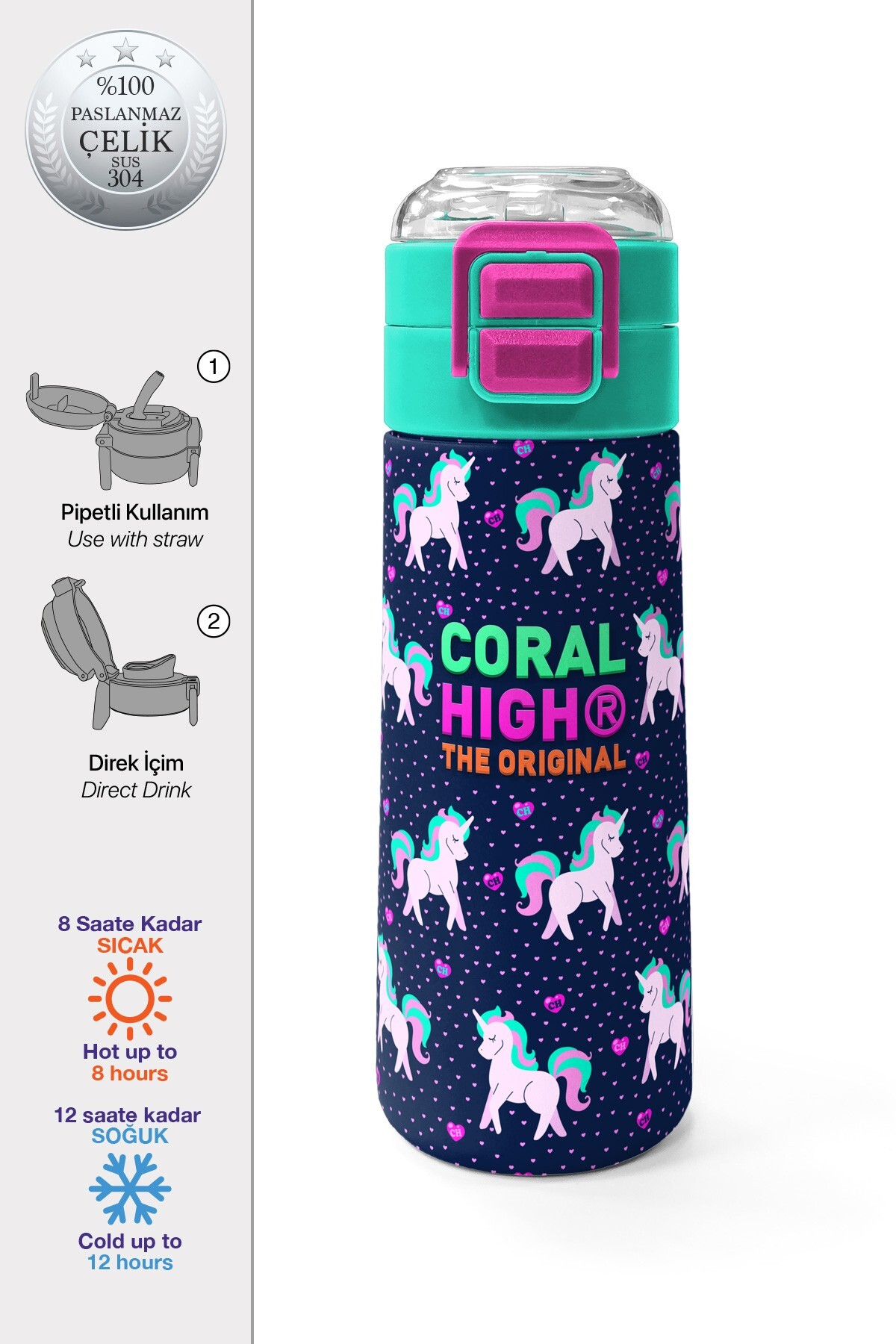 Coral High Kids Lacivert Pembe Unicorn Desenli Pipetli ve Direkt İçim Çelik Termos 500 ml 31915