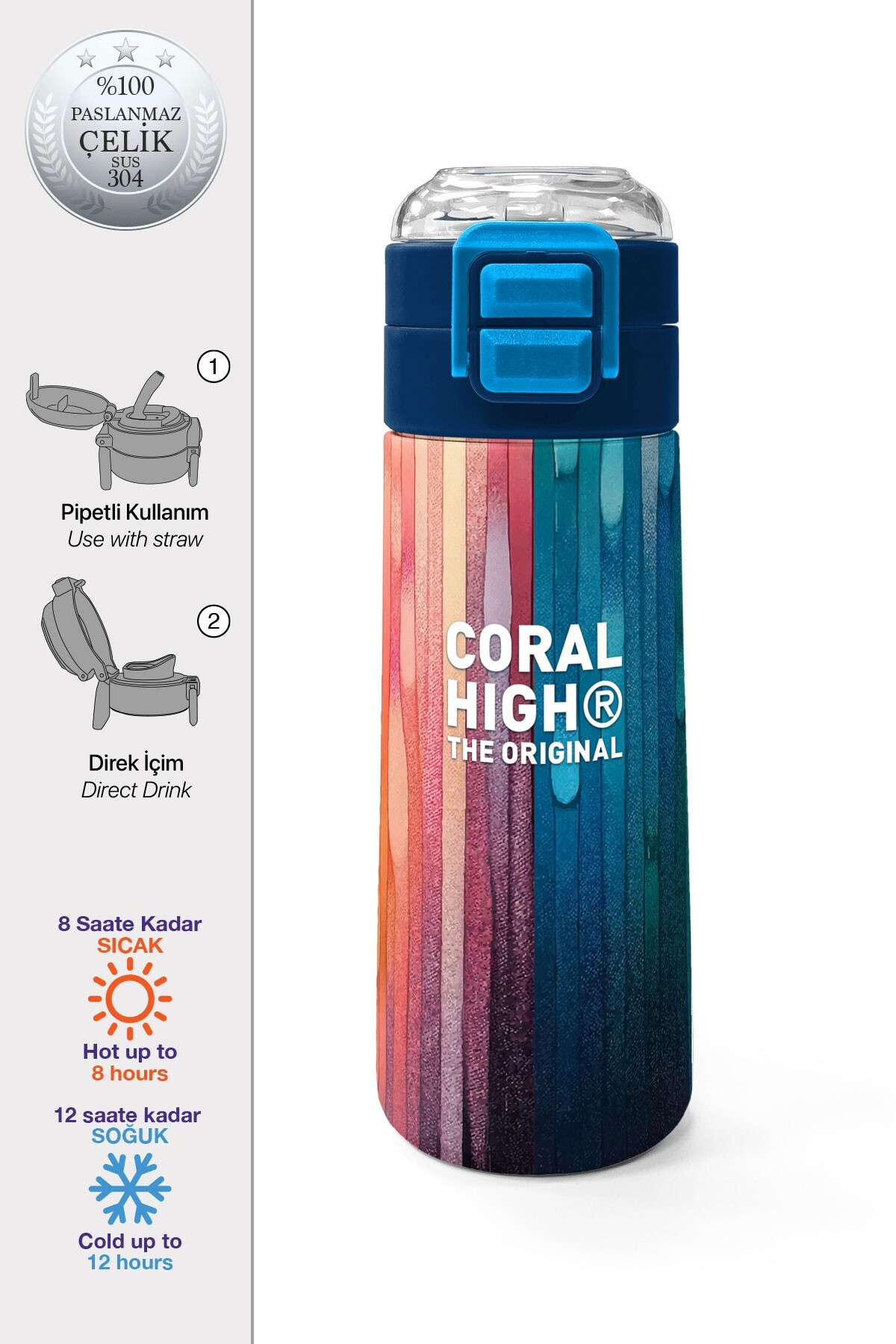 Coral High Kids Renkli Çizgili Desenli Pipetli ve Direkt İçim Çelik Termos 500 ml 31987