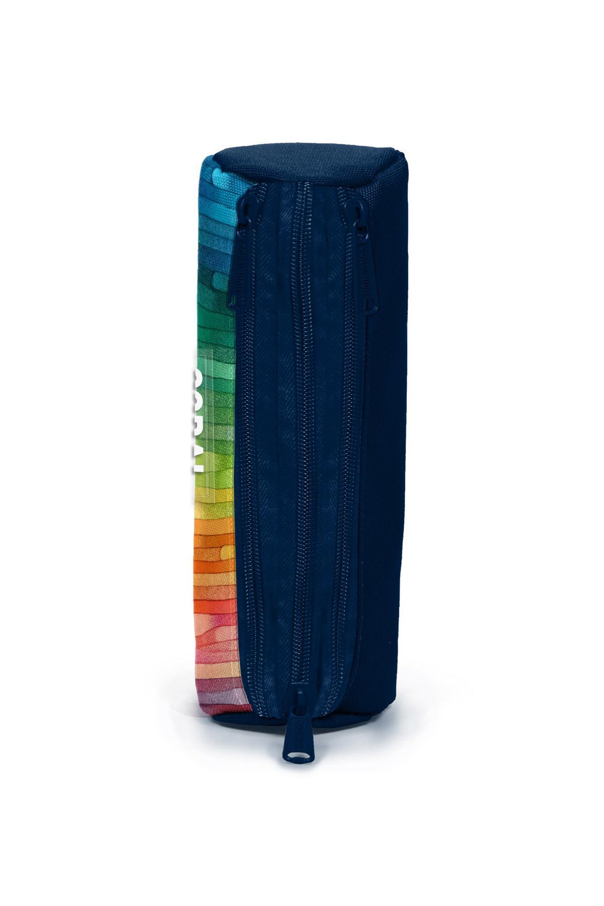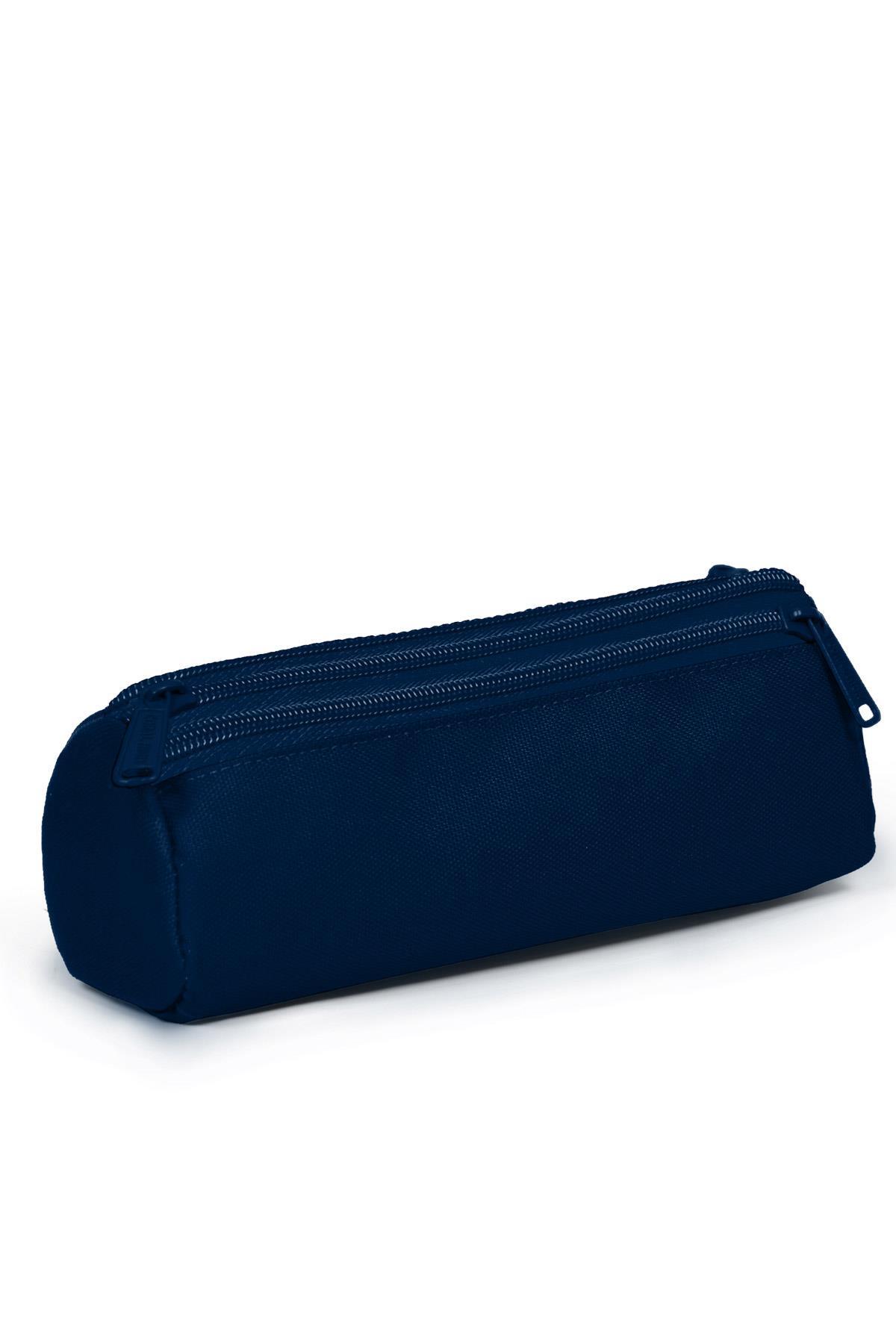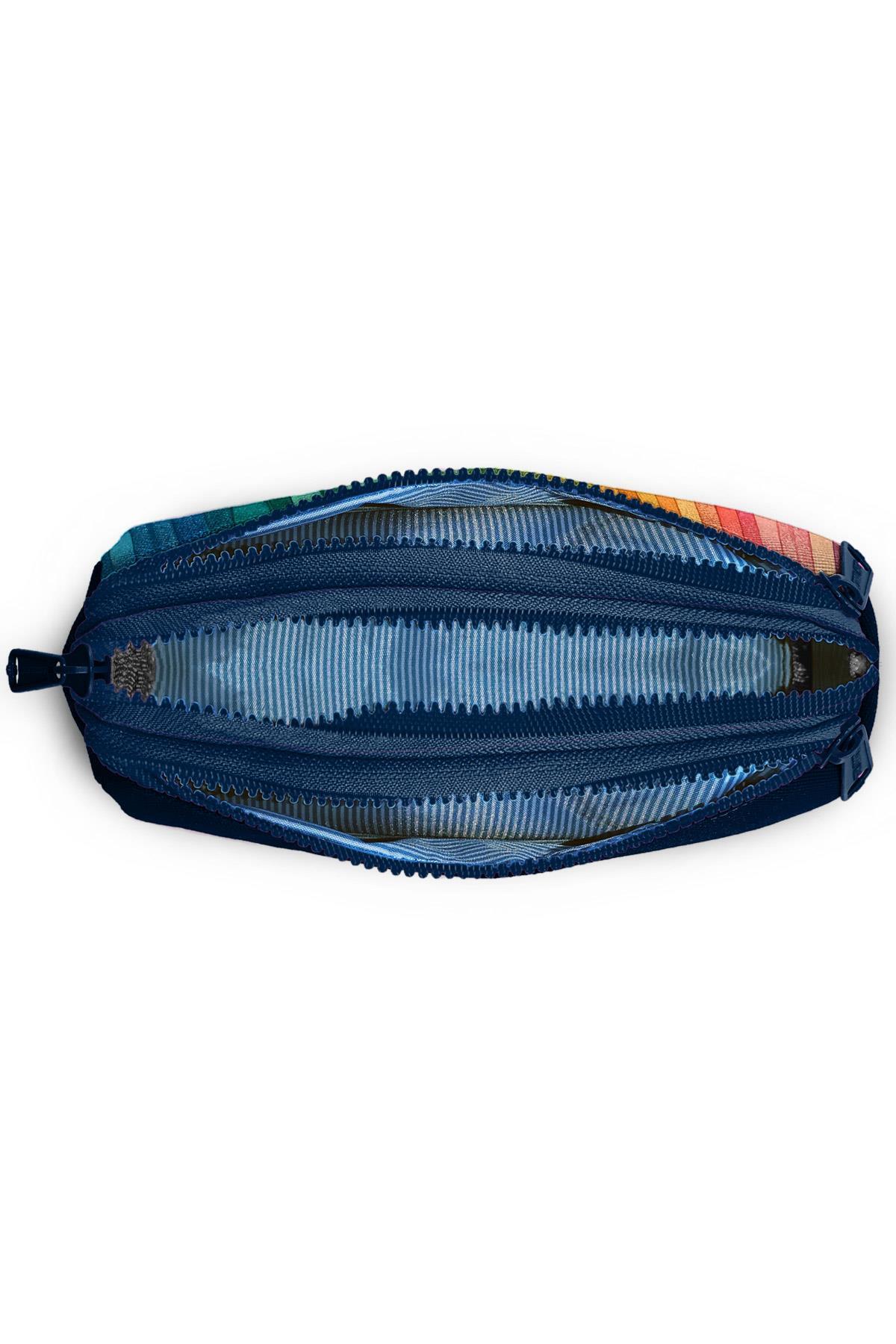 Üç bölmeli, fermuarlı kalem çantası.