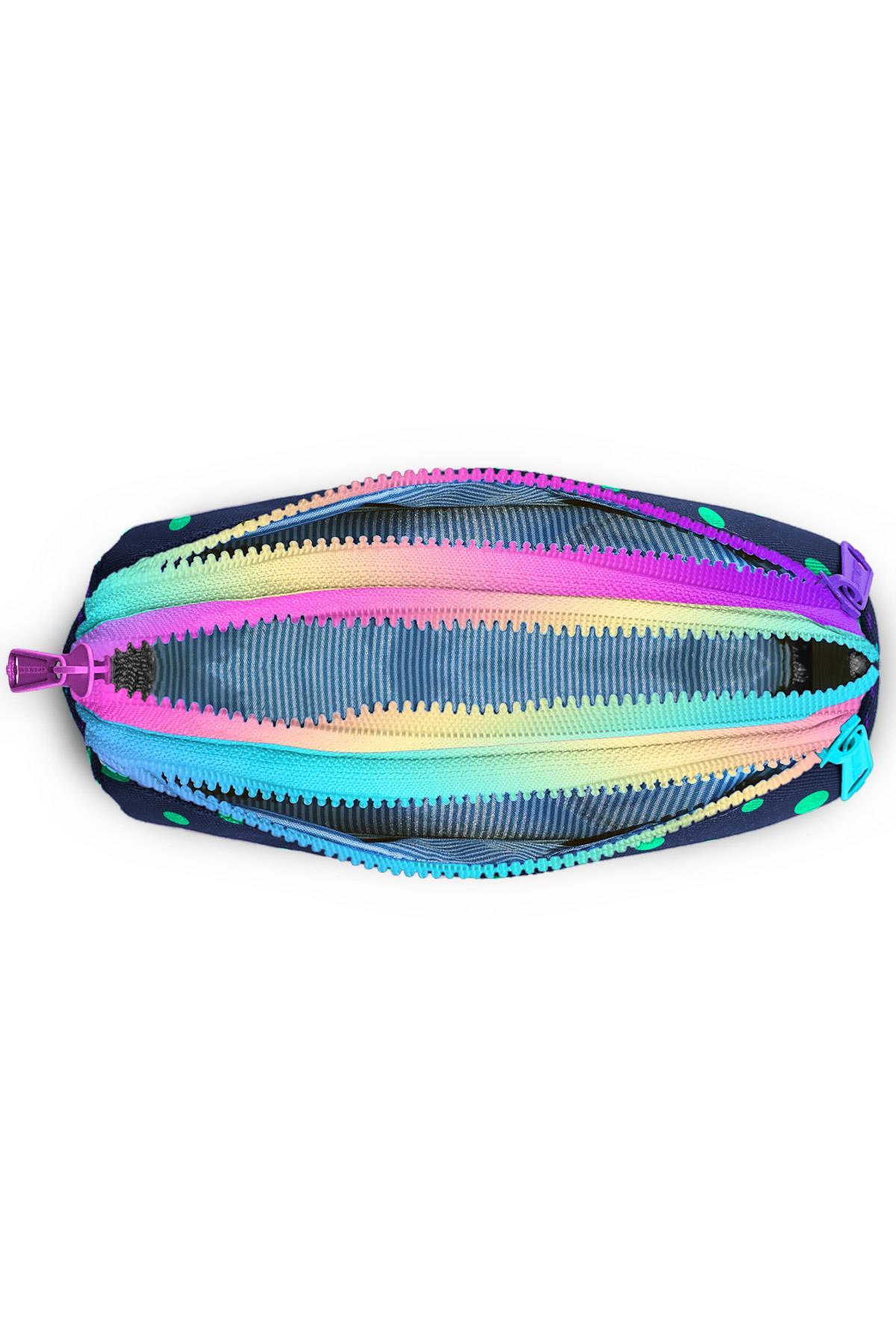 Üç bölmeli, fermuarlı kalem çantası.