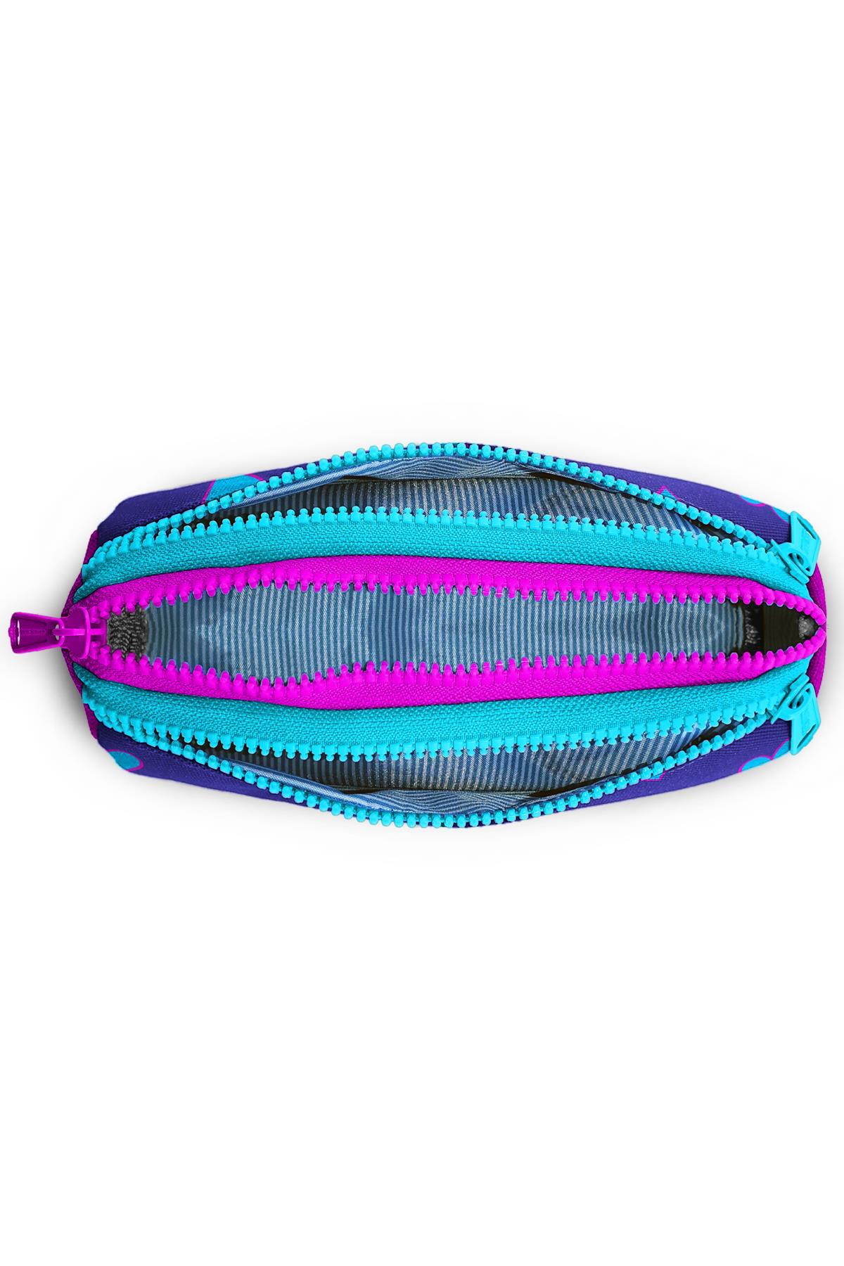Üç bölmeli, fermuarlı kalem çantası.