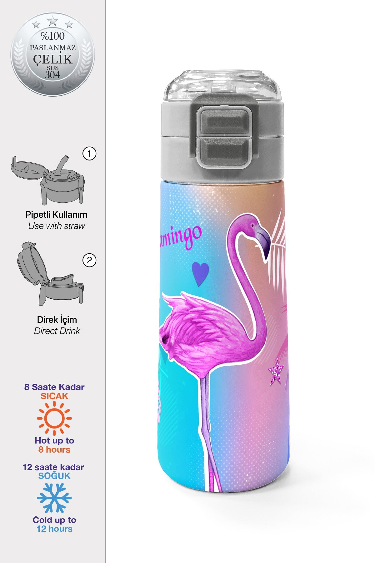 Coral High Kids Lavanta Pembe Flamingo Desenli Pipetli ve Direkt İçim Çelik Termos 500 ml 31921