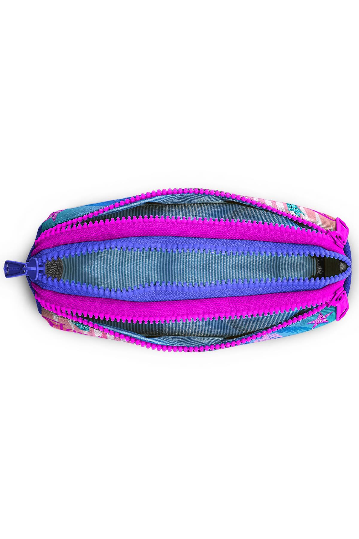 Üç bölmeli, fermuarlı kalem çantası.