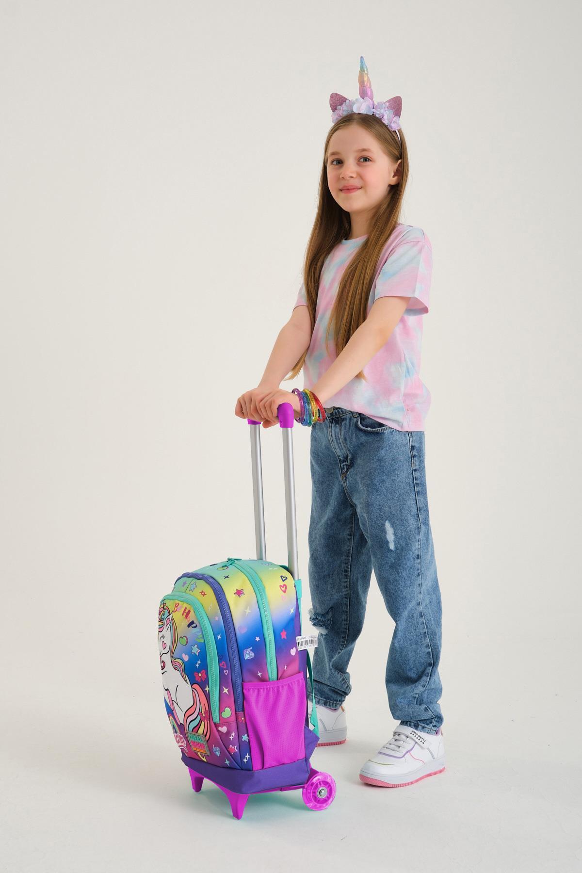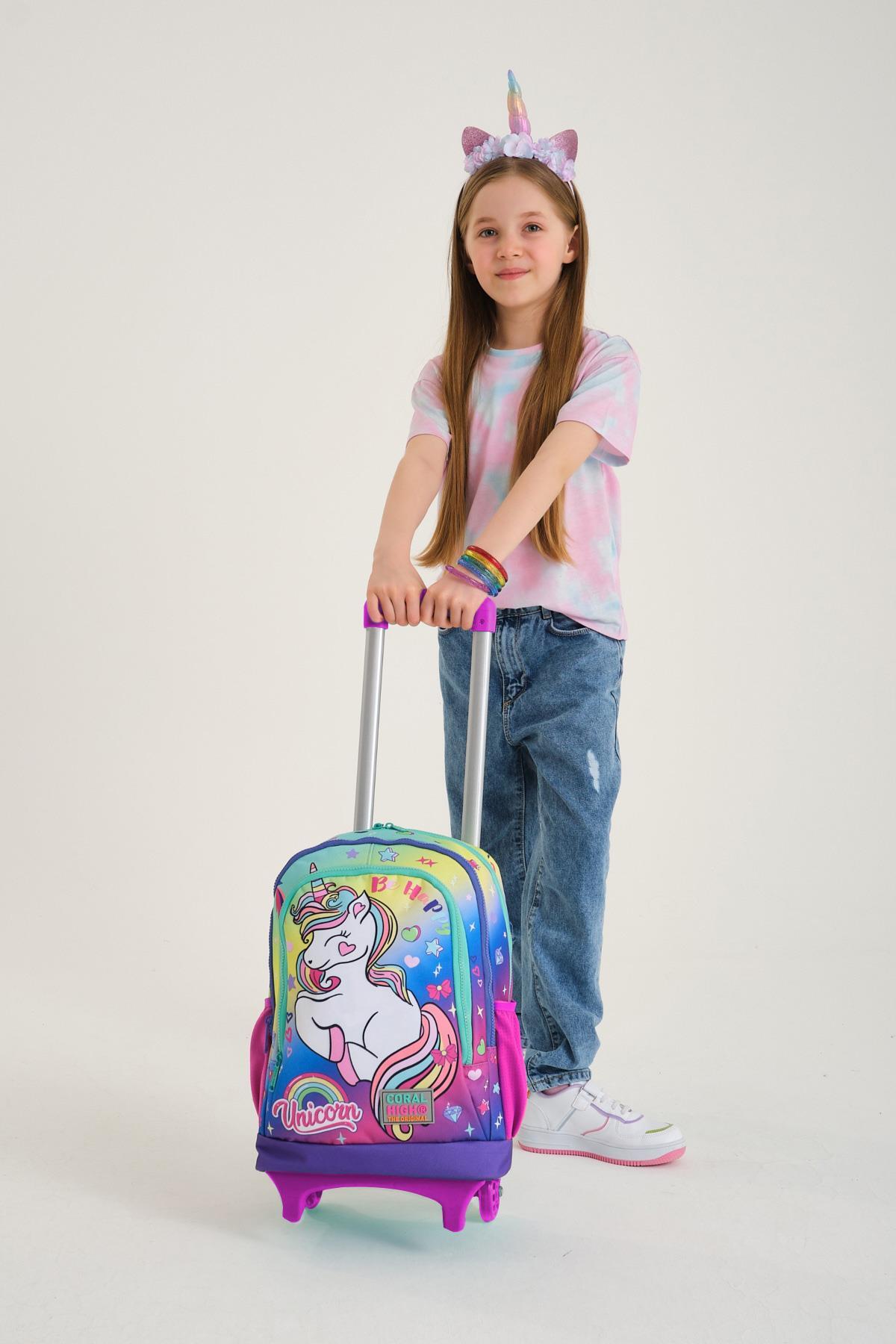 Coral High Kids Lavanta Su Yeşili Unicorn Desenli Üç Bölmeli Çekçekli Okul Sırt Çantası 23929