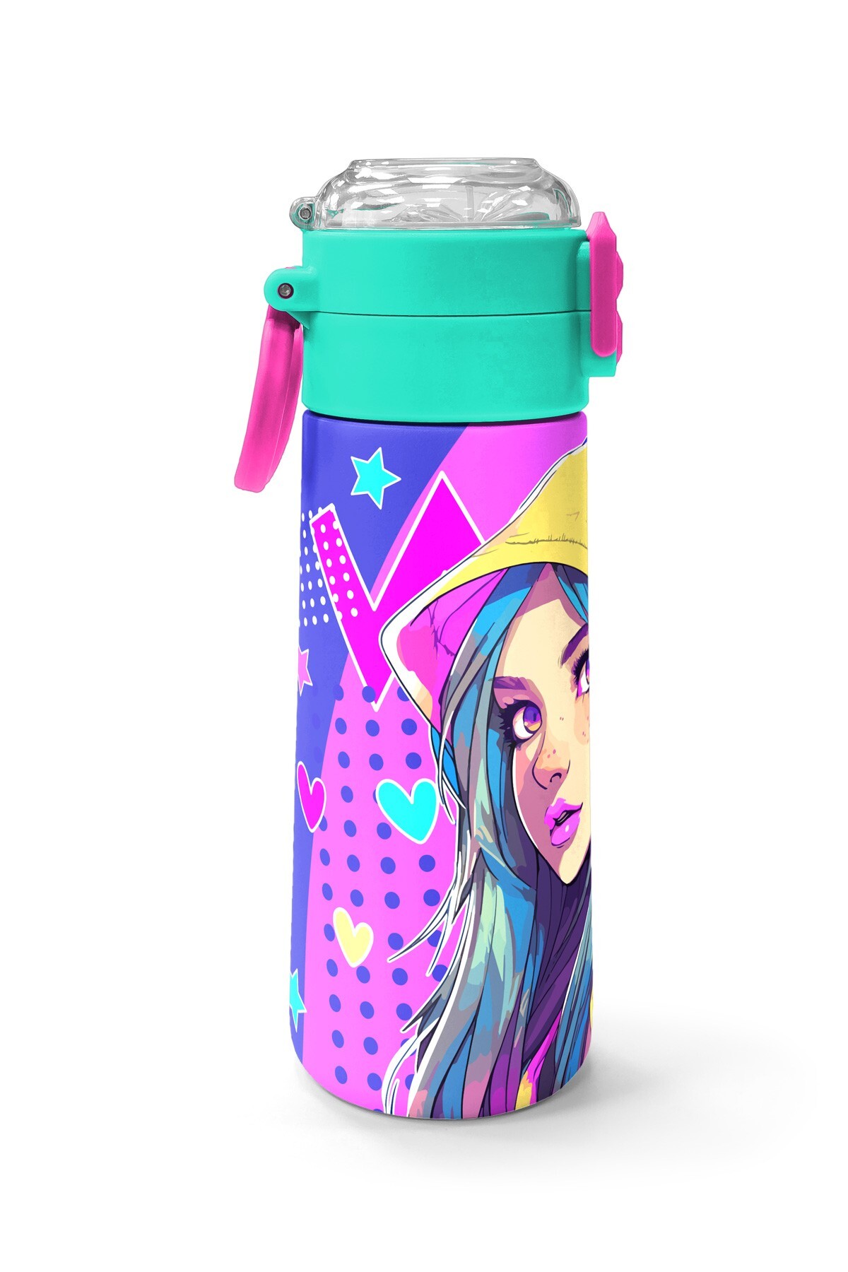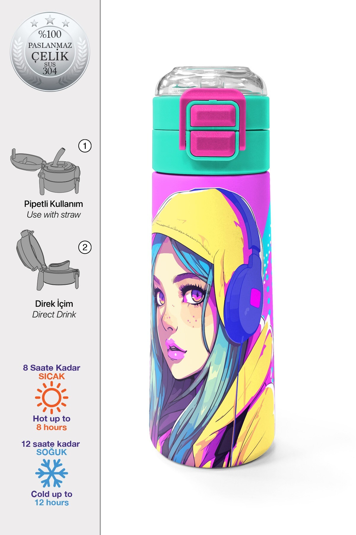 Coral High Kids Pembe Mor Fashion Girl Desenli Pipetli ve Direkt İçim Çelik Termos 500 ml 31956