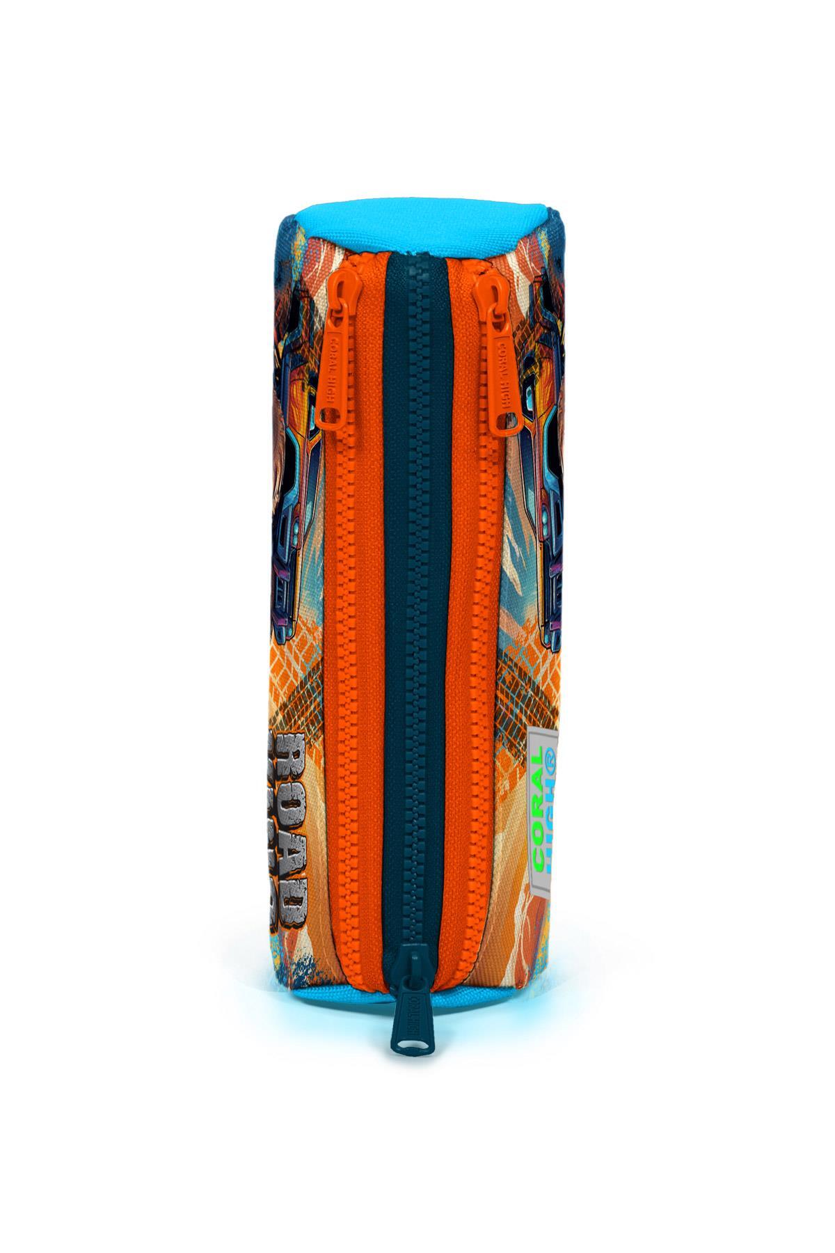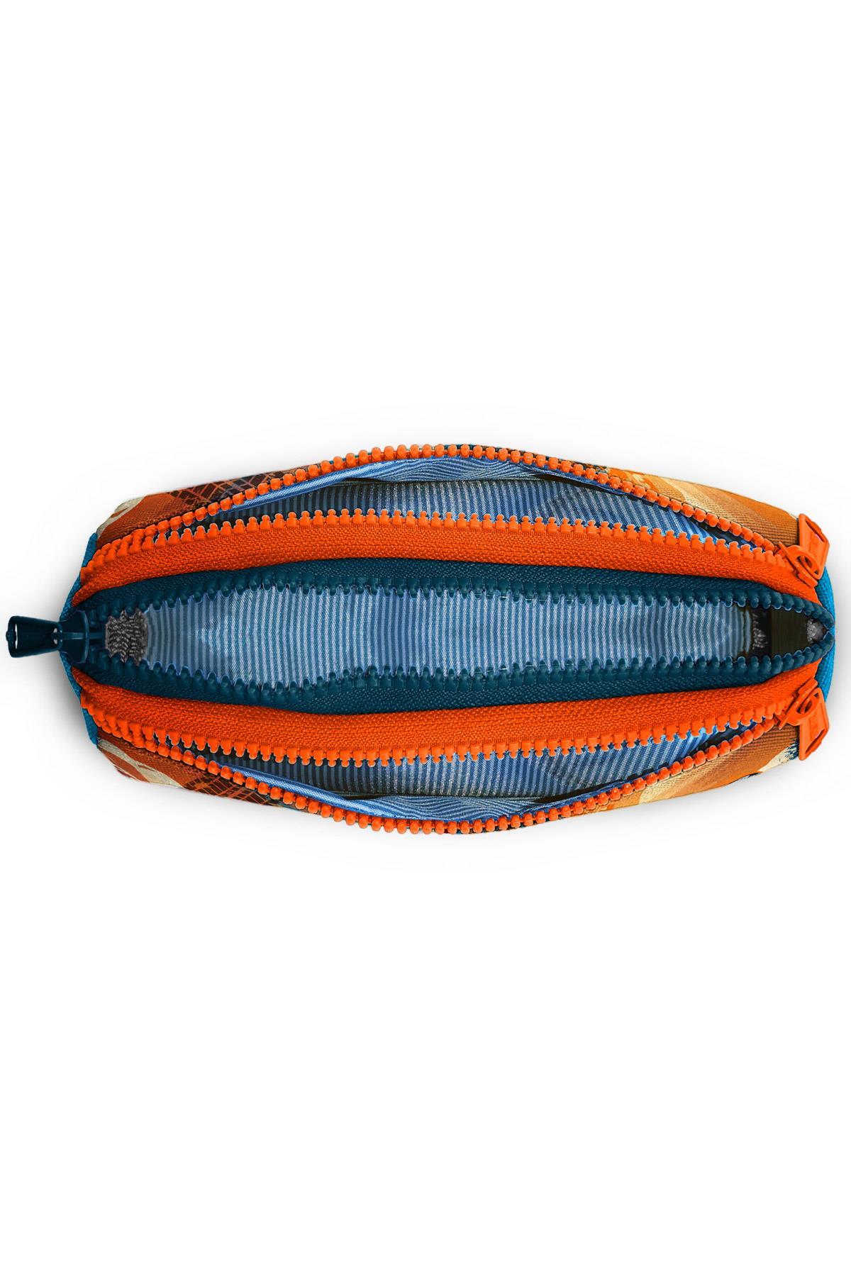 Üç bölmeli, fermuarlı kalem çantası.