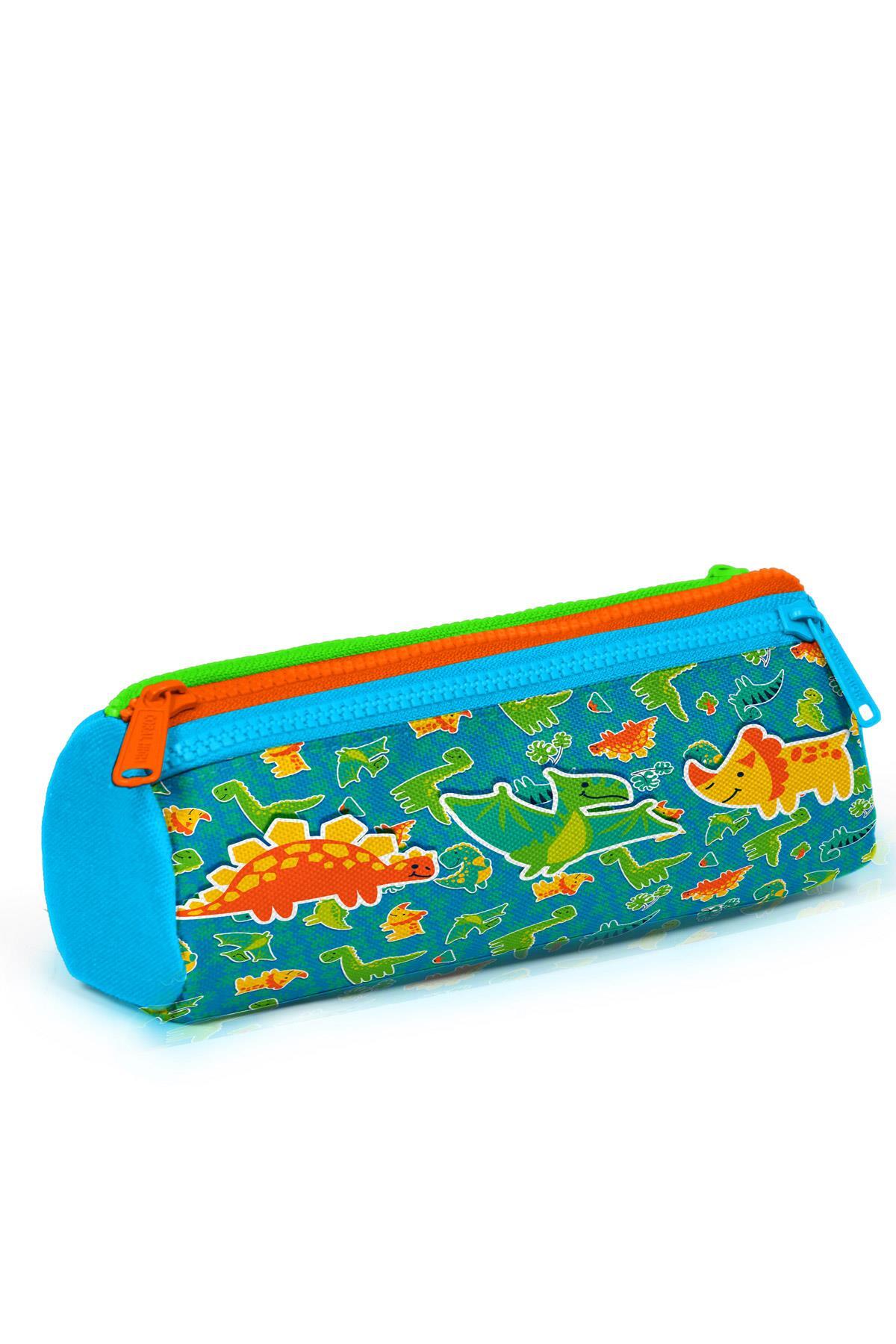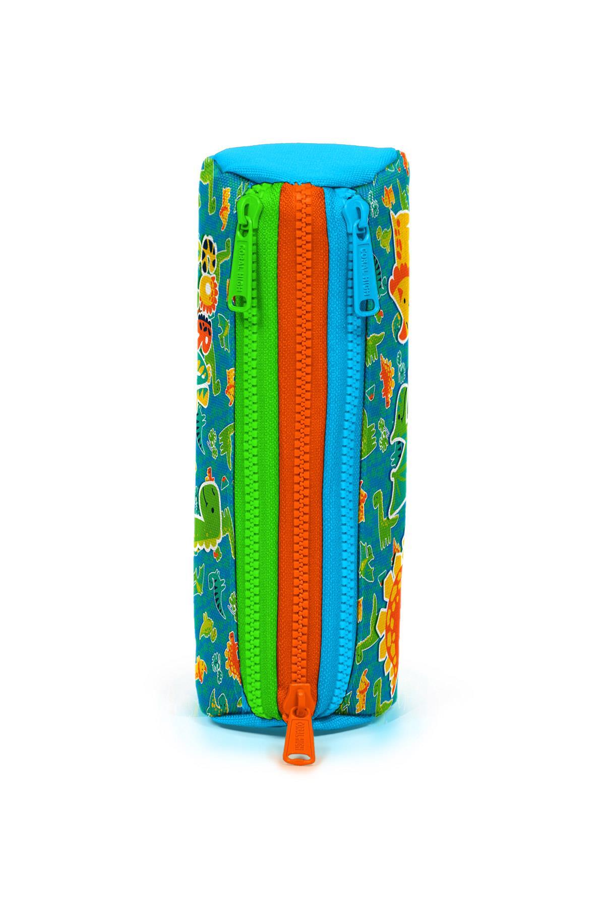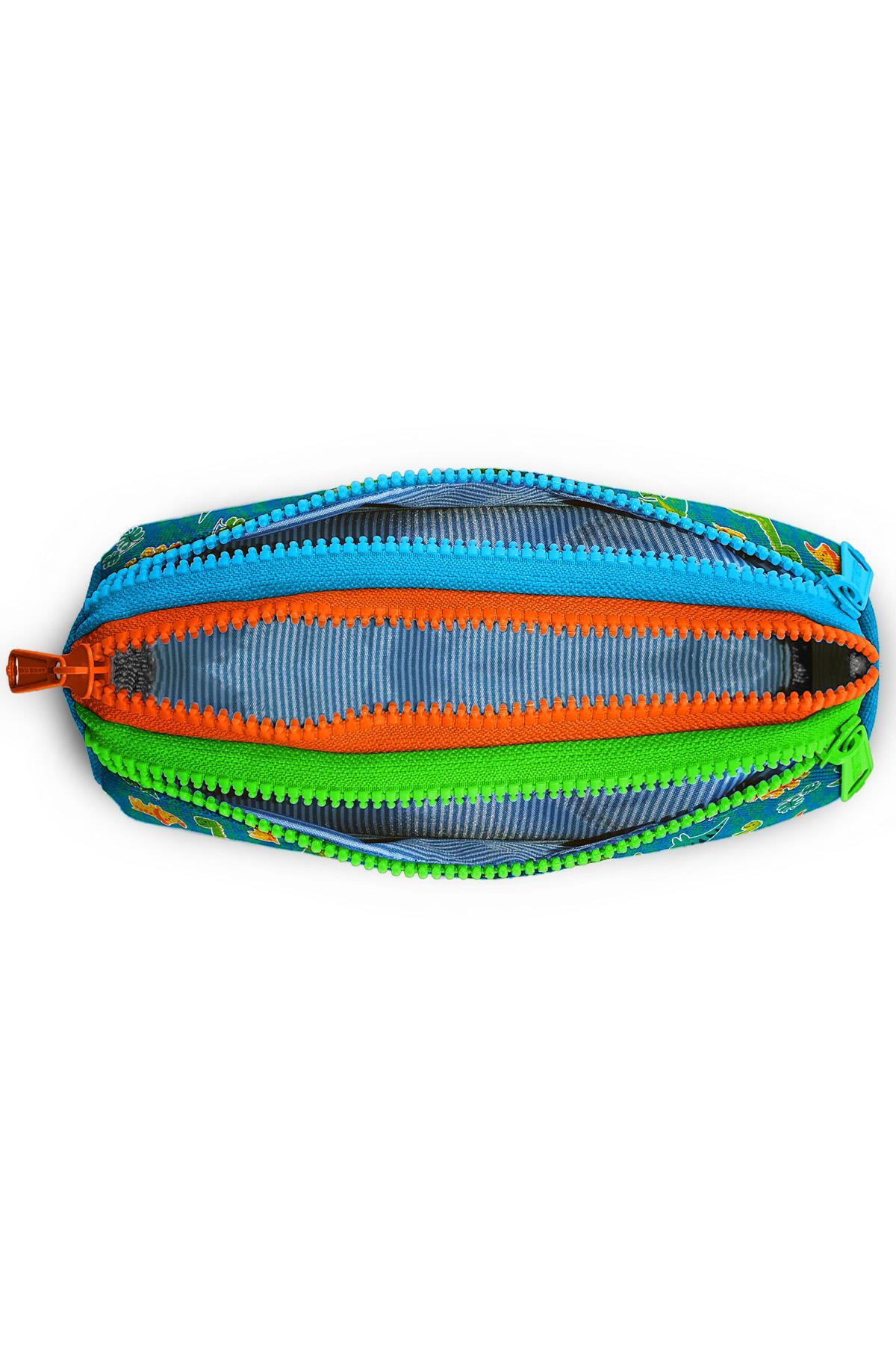 Üç bölmeli, fermuarlı kalem çantası.
