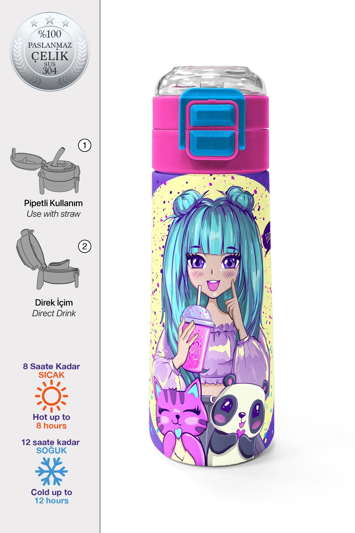 Coral High Kids Mor Pembe Anime Kız Desenli Pipetli ve Direkt İçim Çelik Termos 500 ml 31942