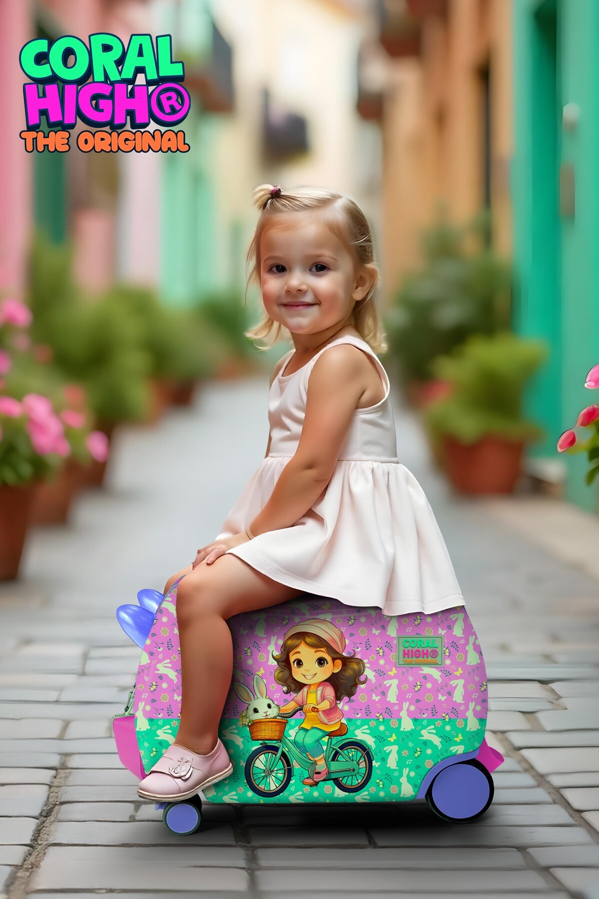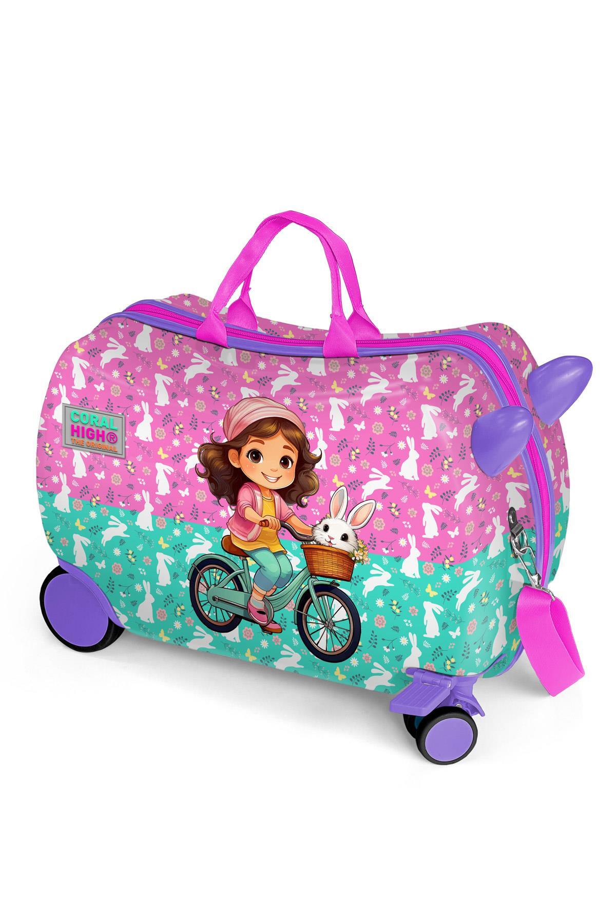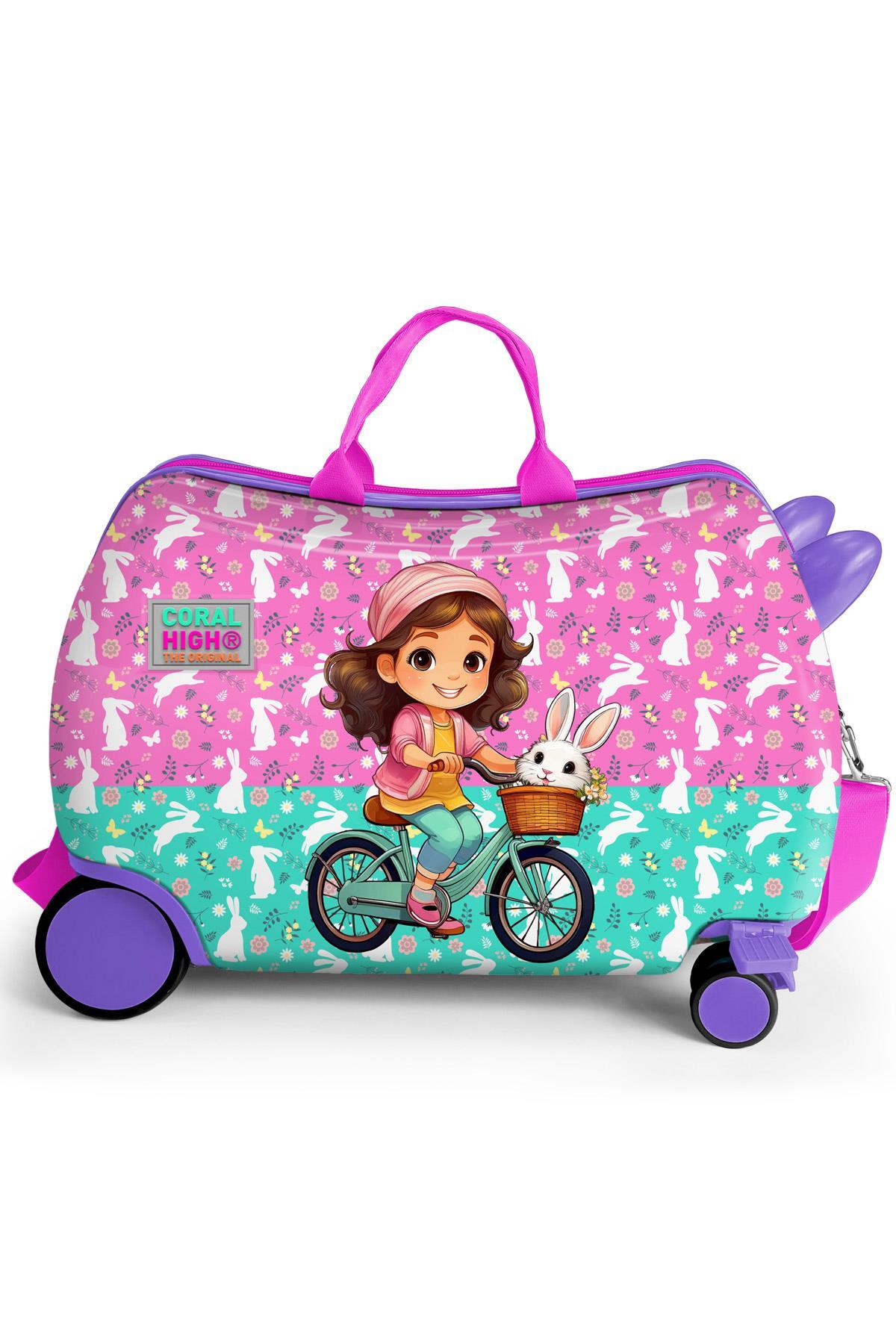 Coral High Kids Mor Pembe Bisikletli Kız Desenli Otur-Çek Çocuk Valizi 16356