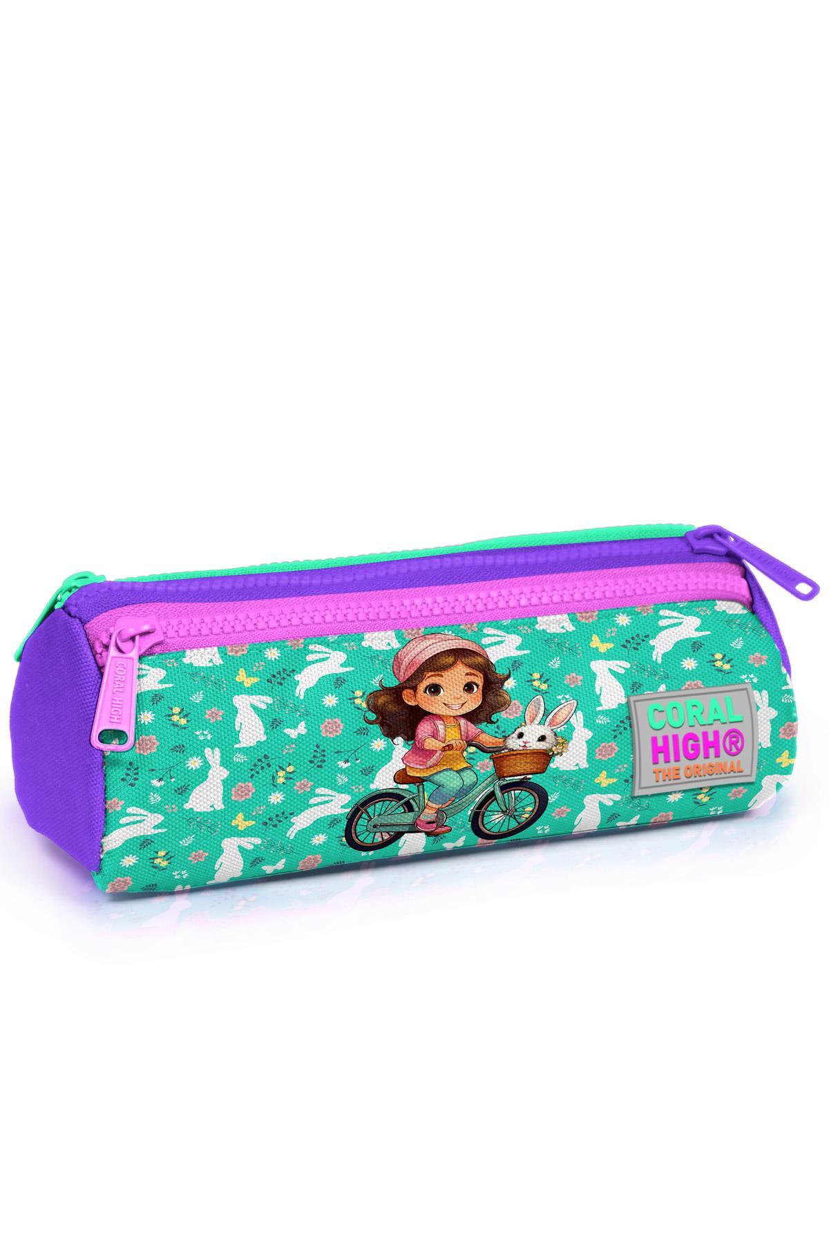 Coral High Kids Mor Pembe Bisikletli Kız Desenli Üç Bölmeli Kalem Çantası 22147