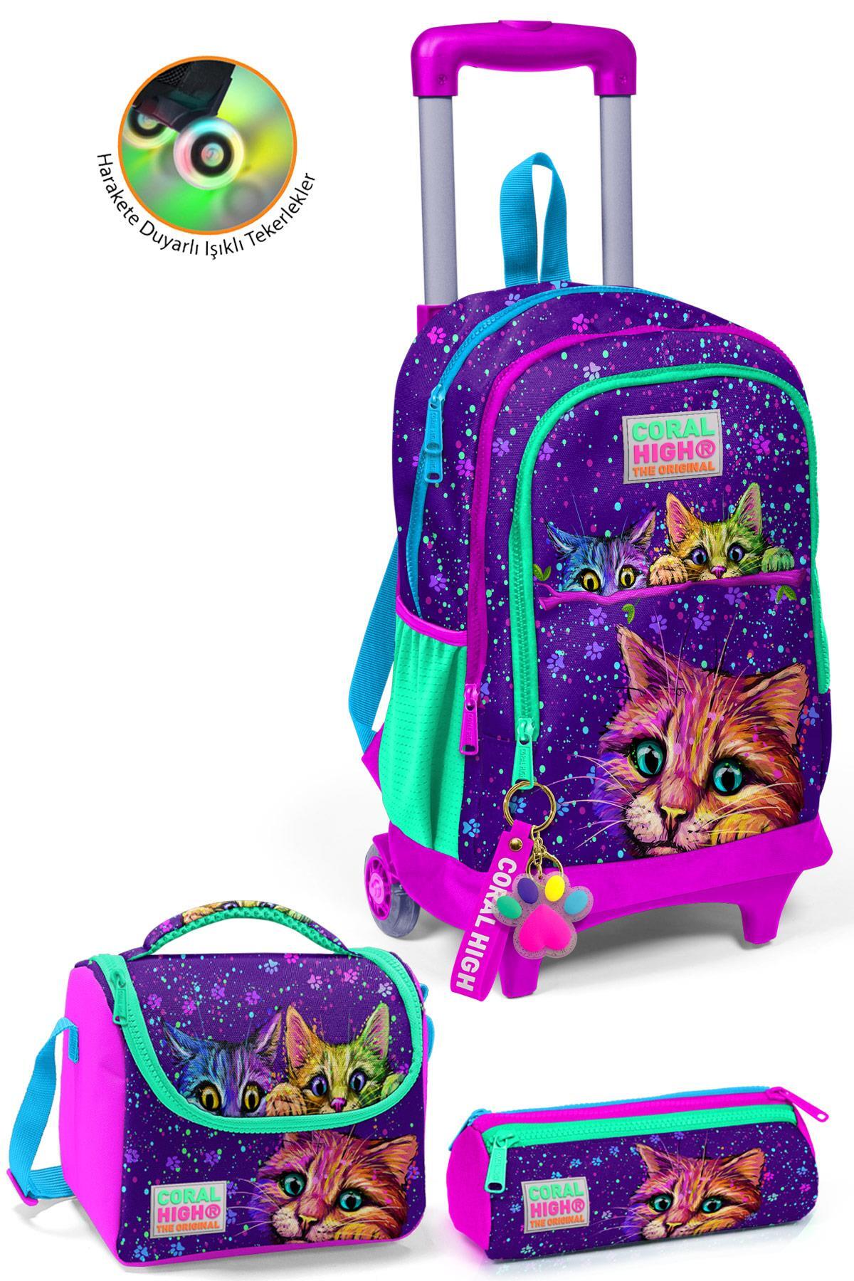 Coral High Kids Mor Pembe Kedi Desenli Çekçekli 3'lü Çanta Seti SET0123932