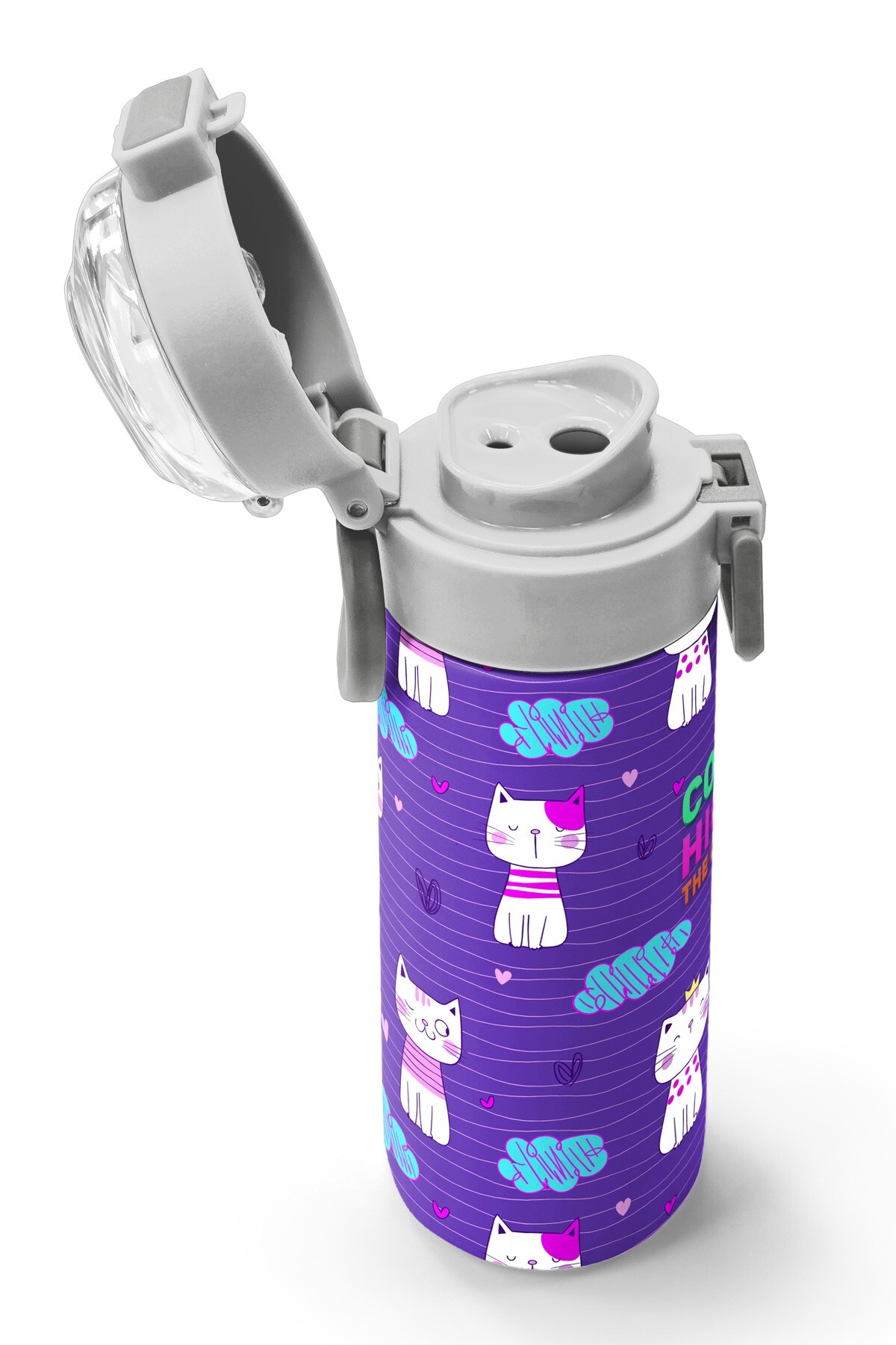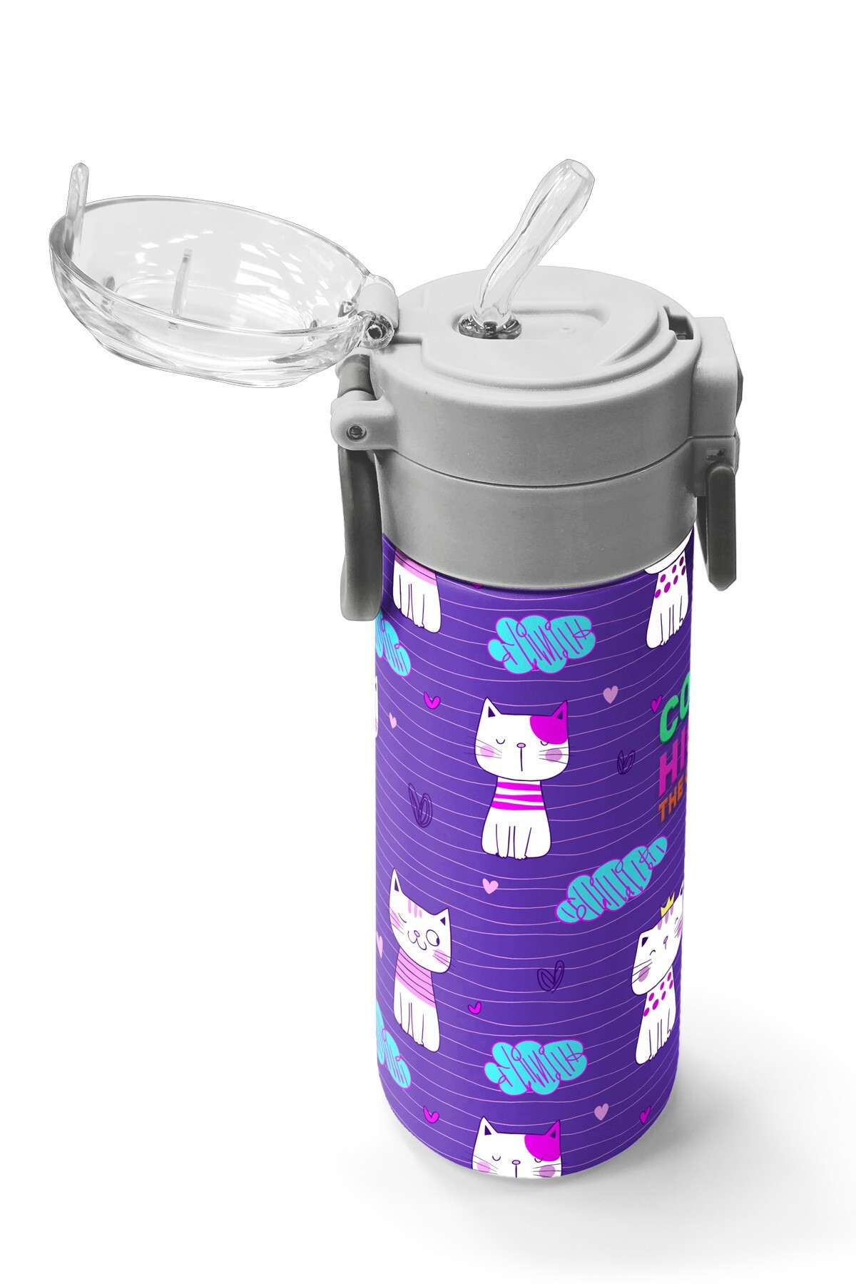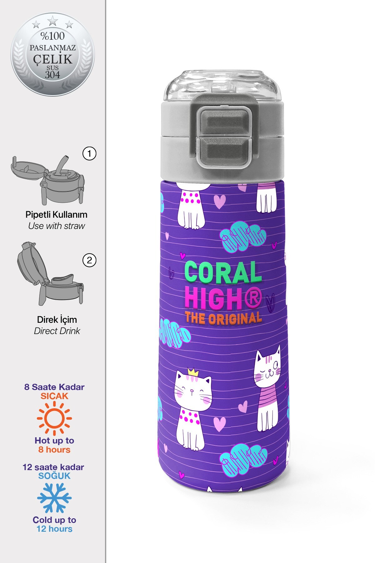 Coral High Kids Mor Pembe Kedi Desenli Pipetli ve Direkt İçim Çelik Termos 500 ml 31911