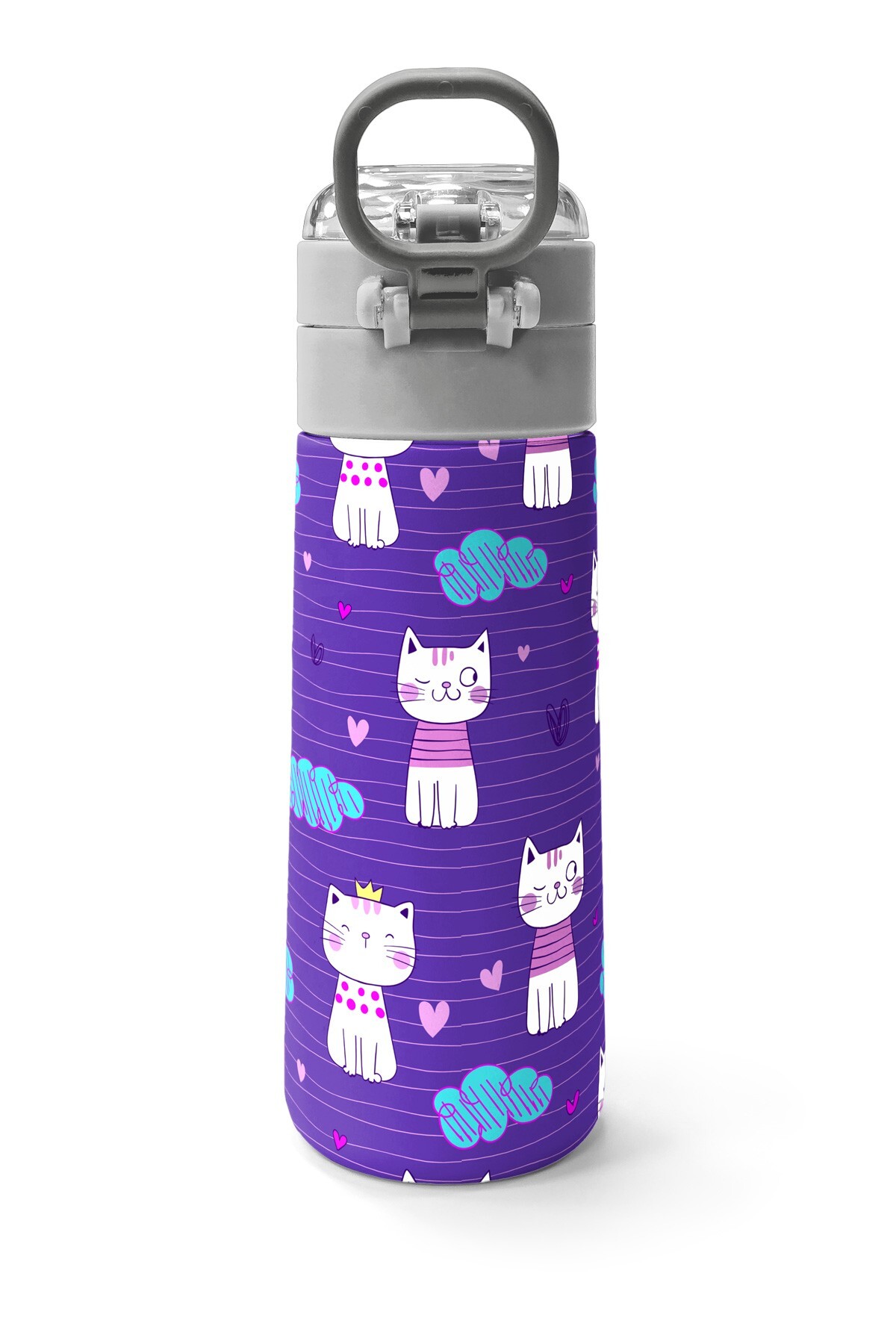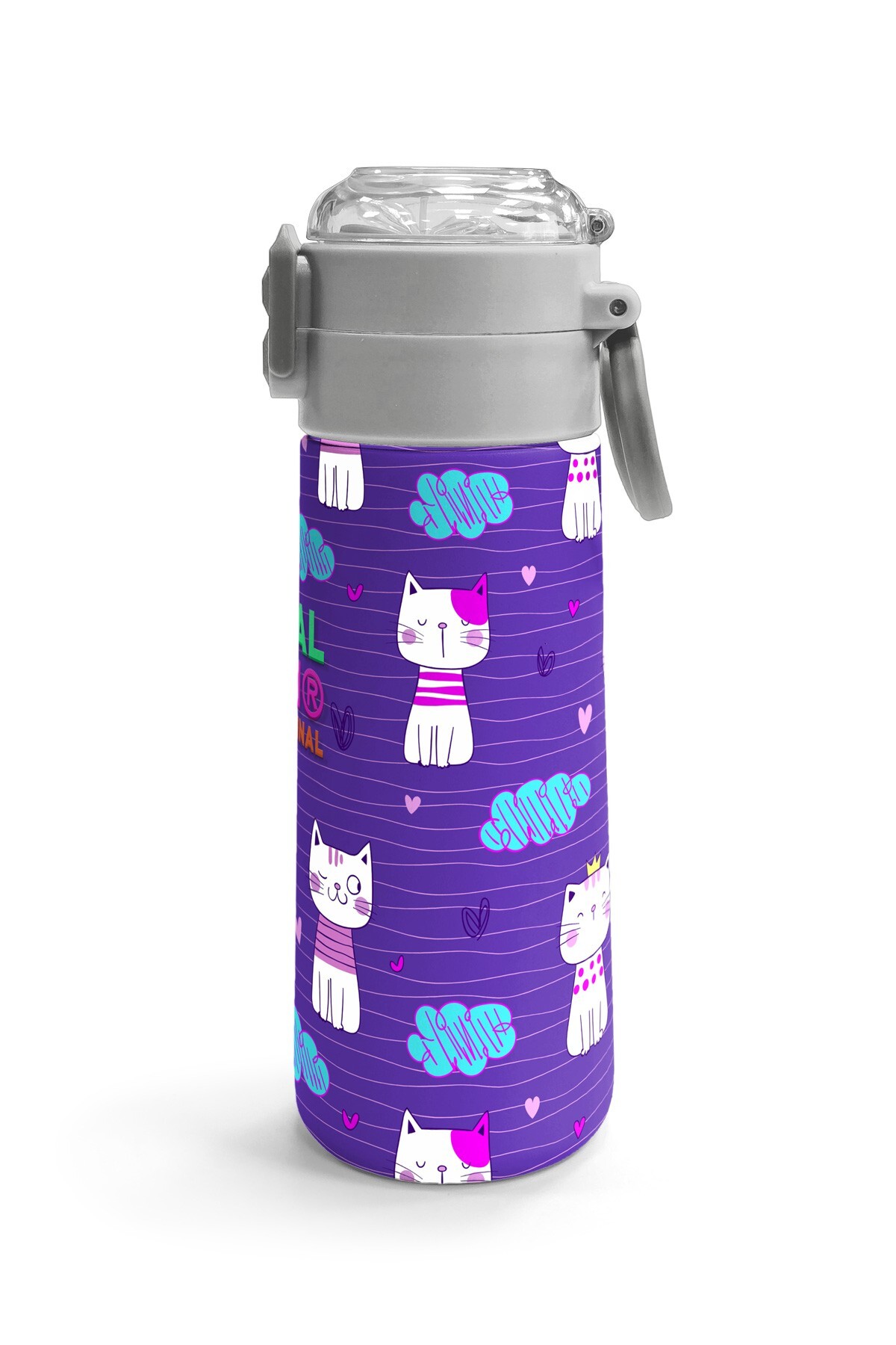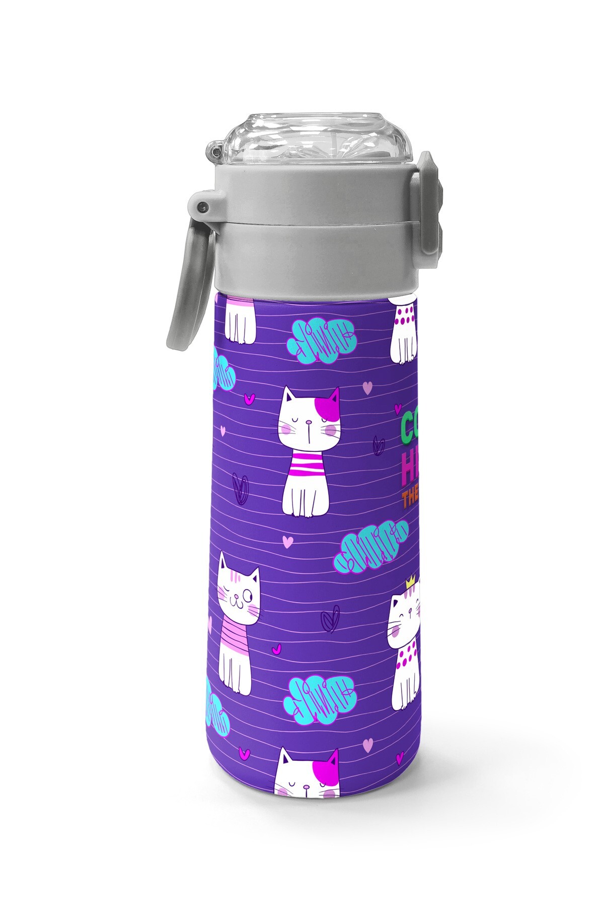 Coral High Kids Mor Pembe Kedi Desenli Pipetli ve Direkt İçim Çelik Termos 500 ml 31911