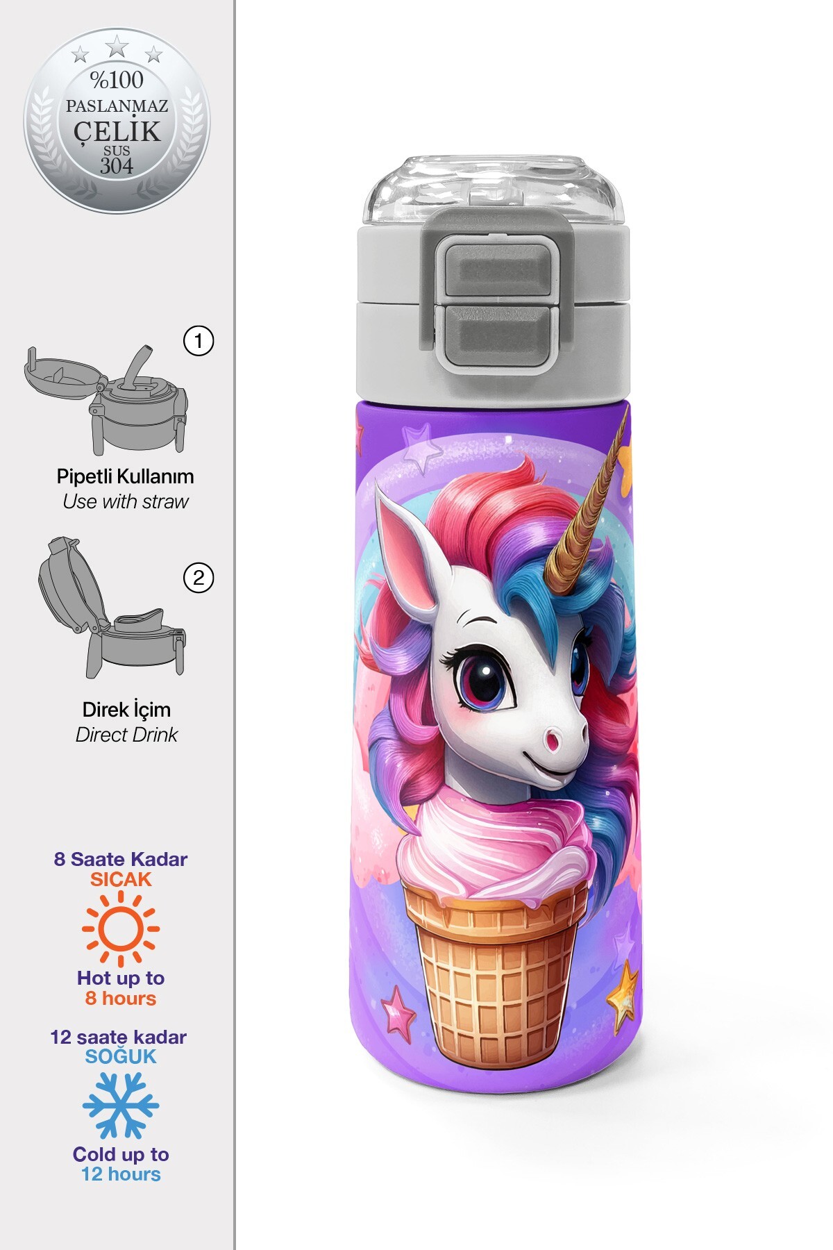 Coral High Kids Mor Pembe Unicorn Dondurma Desenli Pipetli ve Direkt İçim Çelik Termos 500 ml 31859