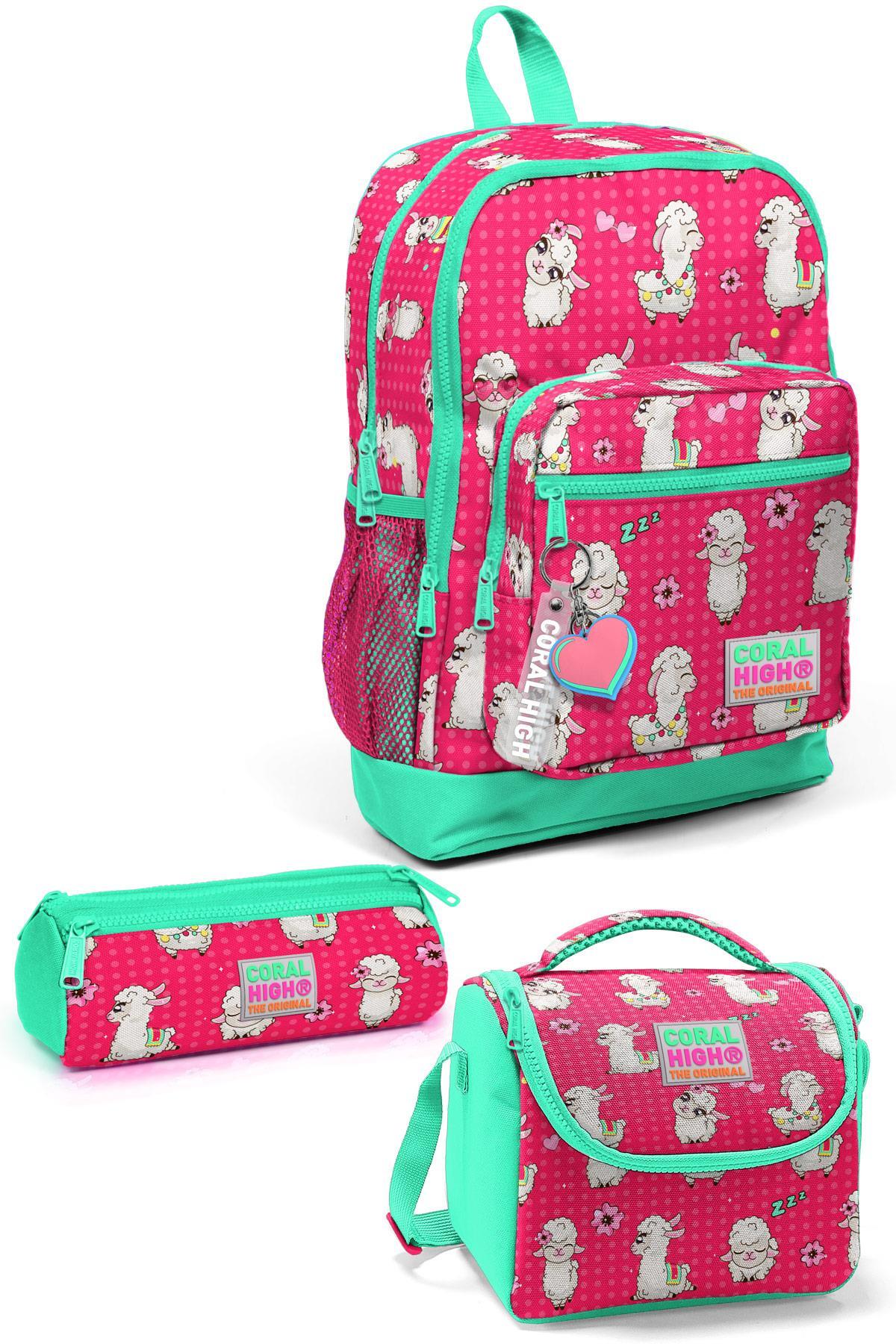 Coral High Kids Neon Mercan Su Yeşili Alpaka Desenli 3’lü Okul Çanta Seti SET0123466