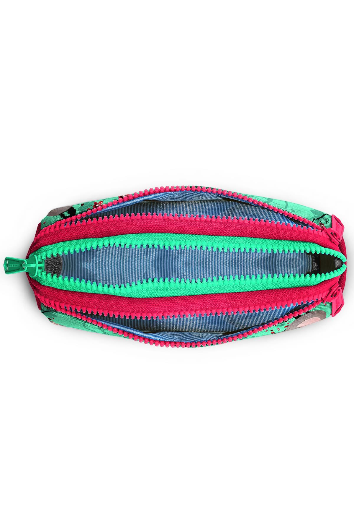 Üç bölmeli, fermuarlı kalem çantası.