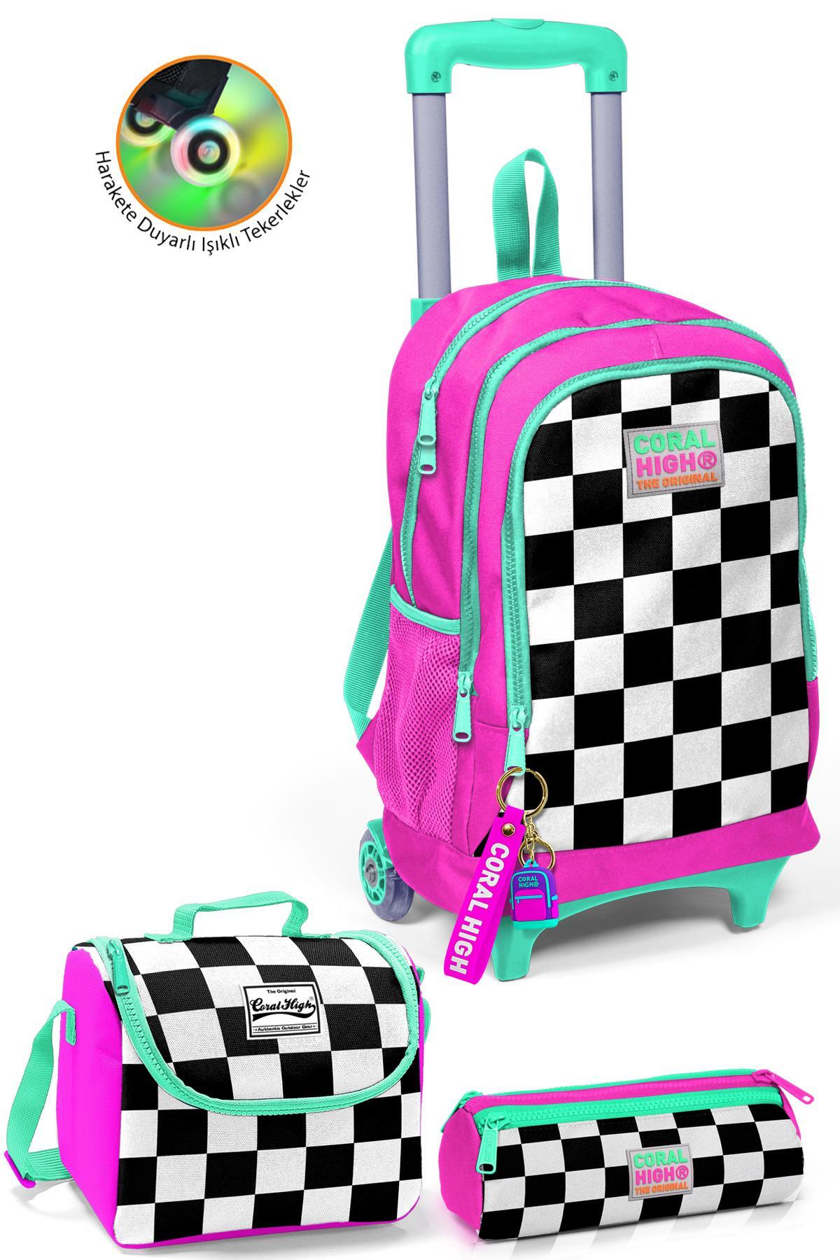 Coral High Kids Neon Pembe Dama Desenli Çekçekli 3'lü Çanta Seti SET0123901