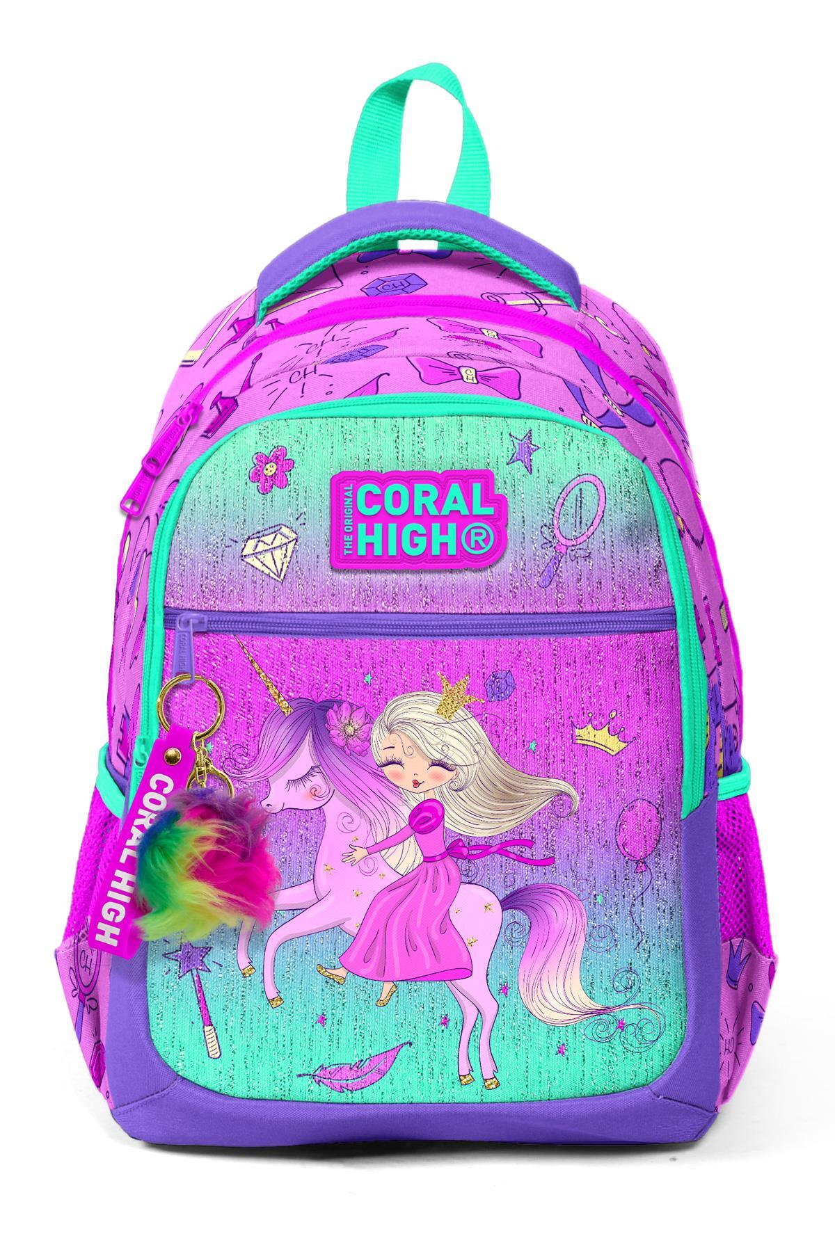 Coral High Kids Açık Pembe Mor Unicornlu Prenses Desenli Üç Bölmeli Okul Sırt Çantası 23481