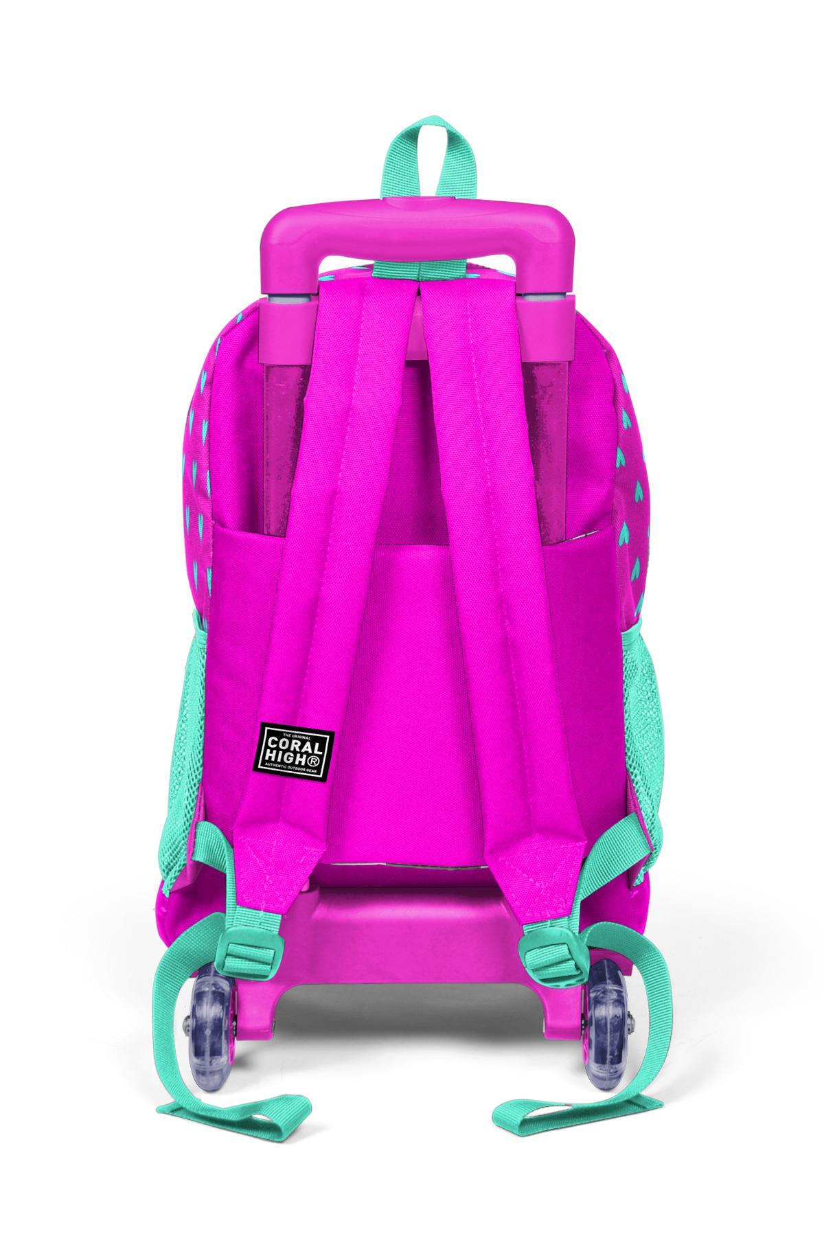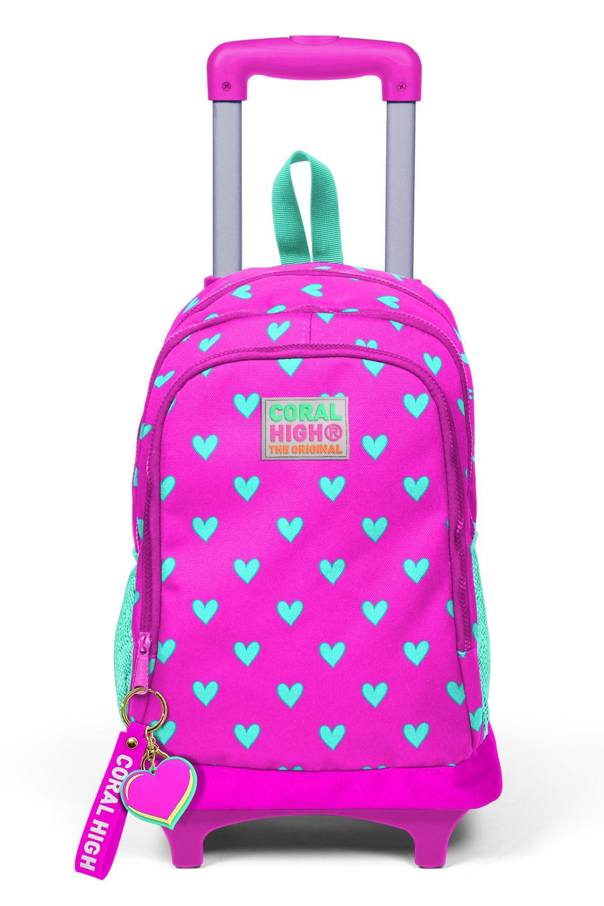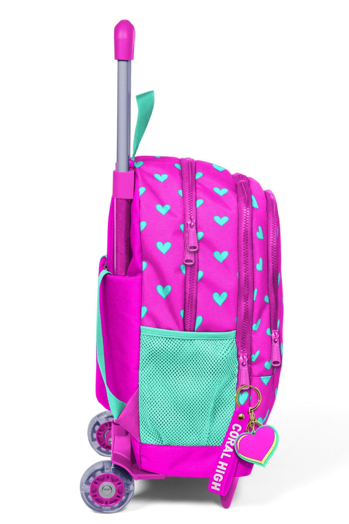 Coral High Kids Neon Pembe Su Yeşili Kalp Desenli Üç Bölmeli Çekçekli Okul Sırt Çantası 23133