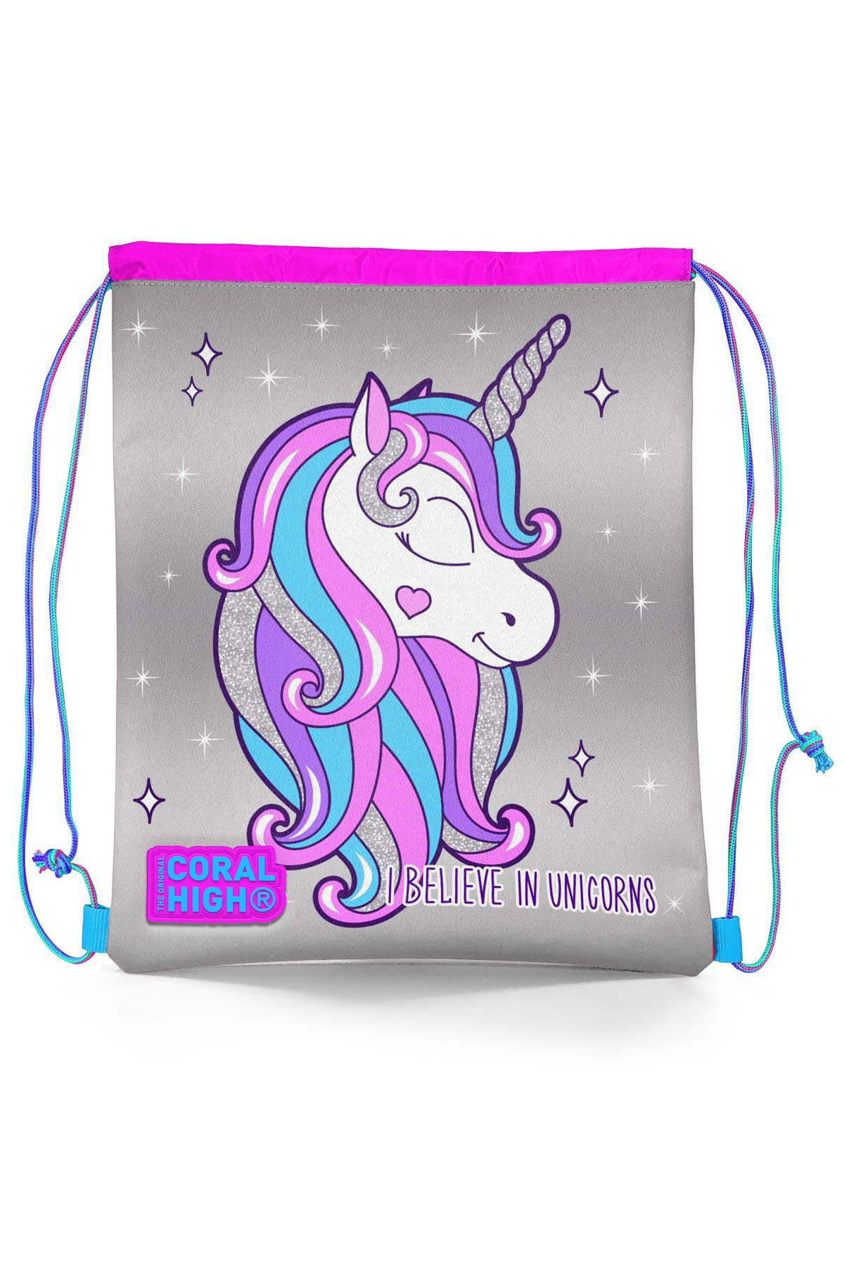 Coral High Kids Pembe Gümüş Simli Unicorn Desenli İpli Büzgülü Sırt Çantası 22482