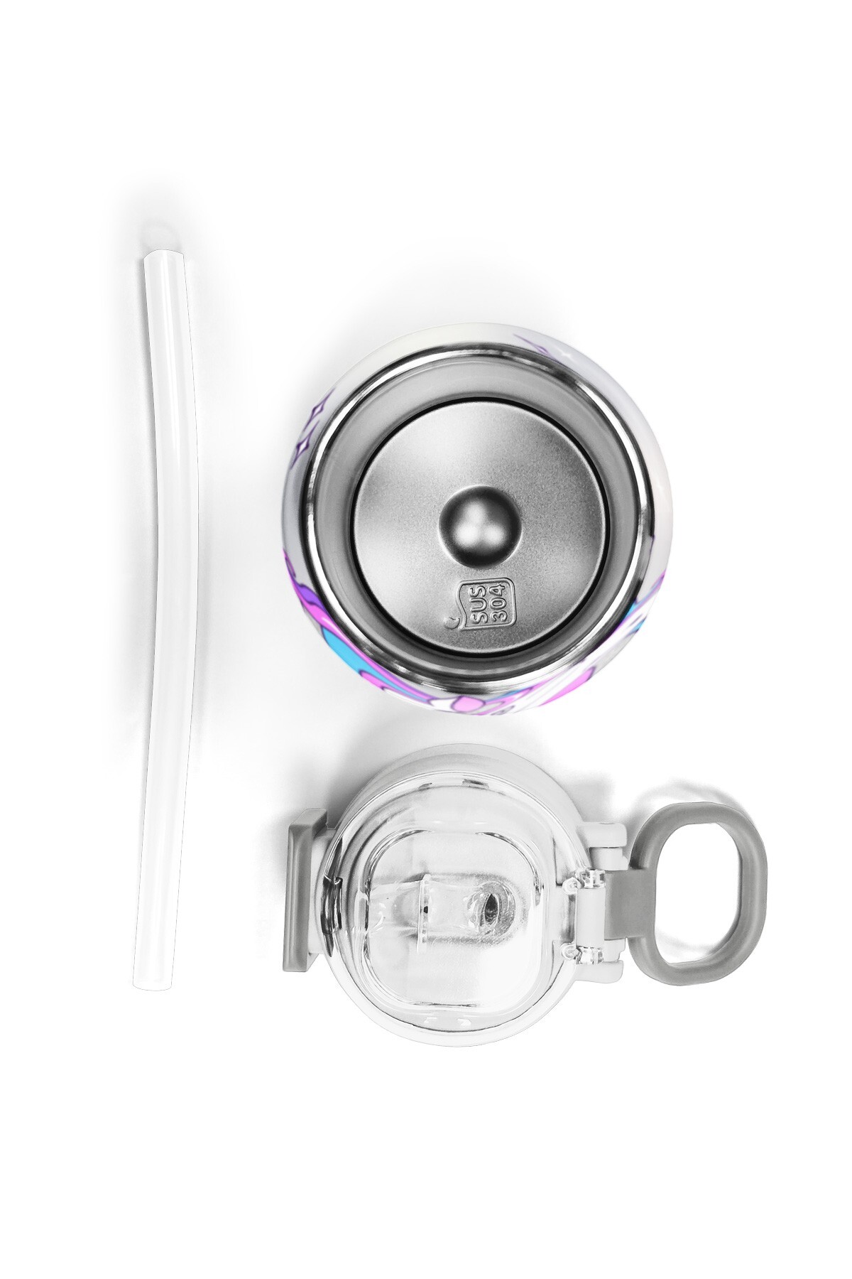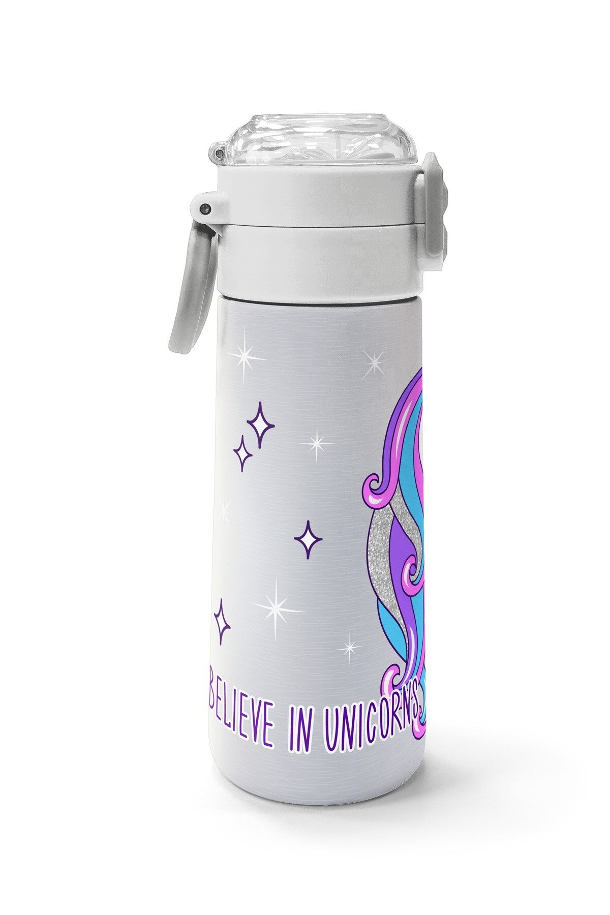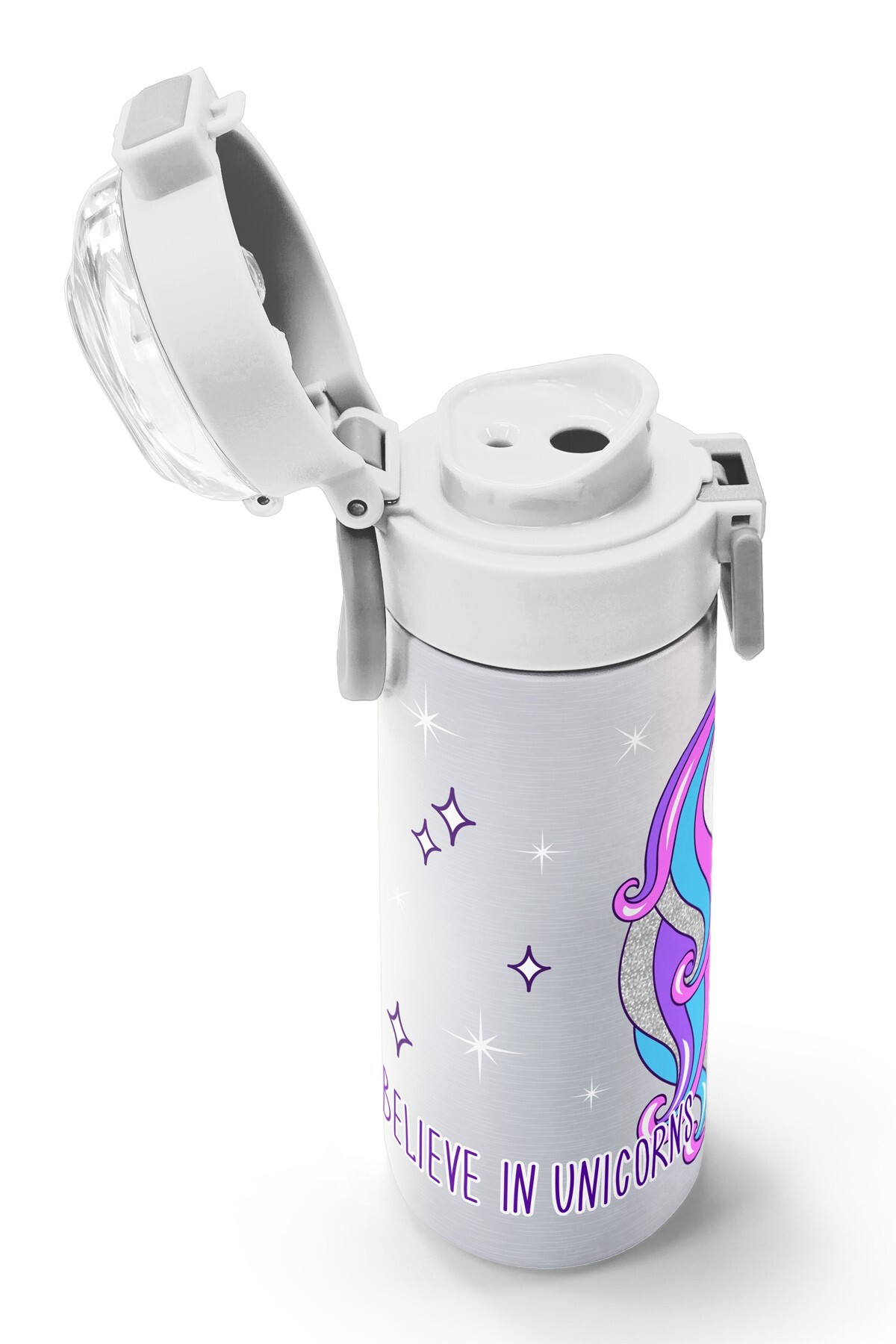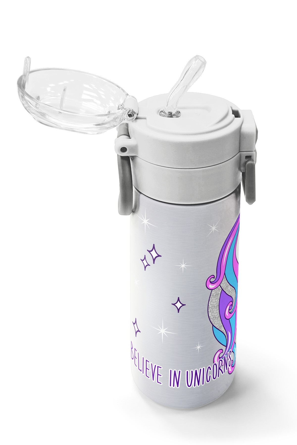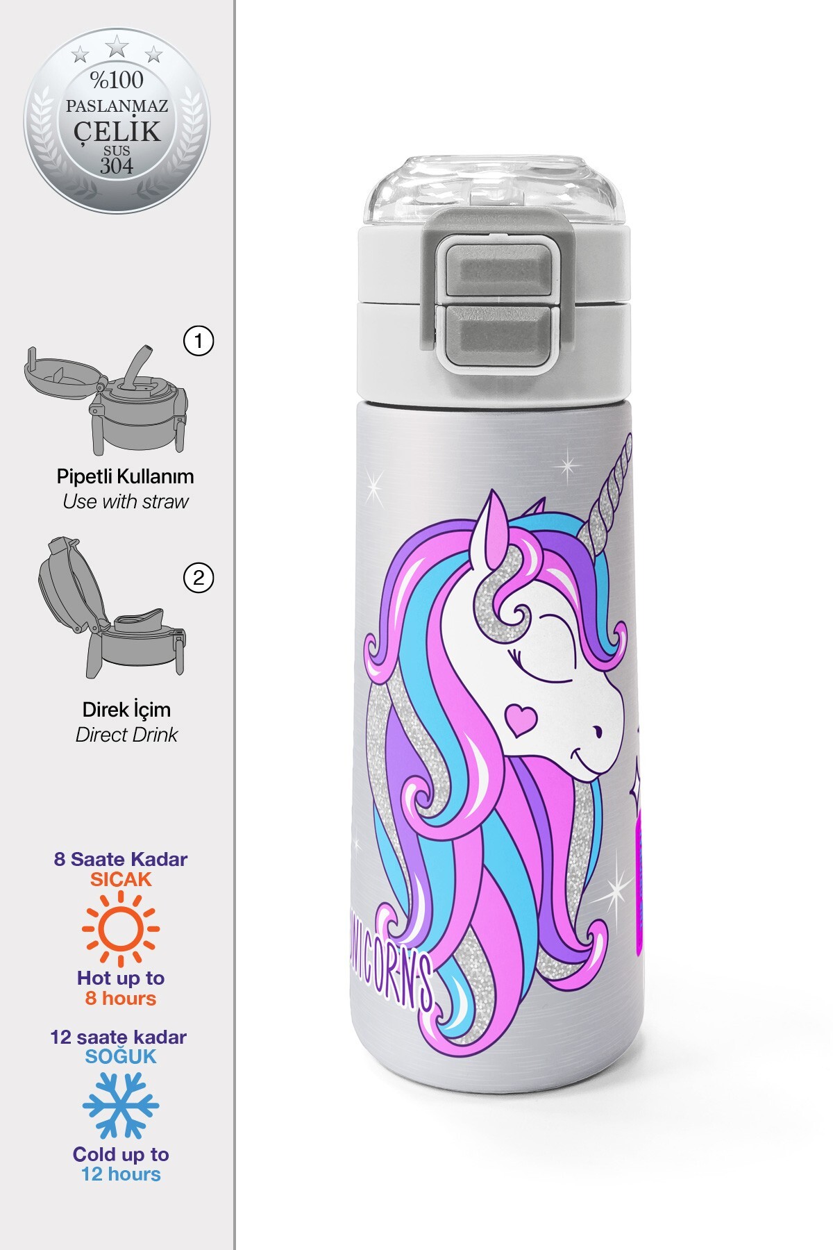 Coral High Kids Pembe Gümüş Unicorn Desenli Pipetli ve Direkt İçim Çelik Termos 500 ml 31821