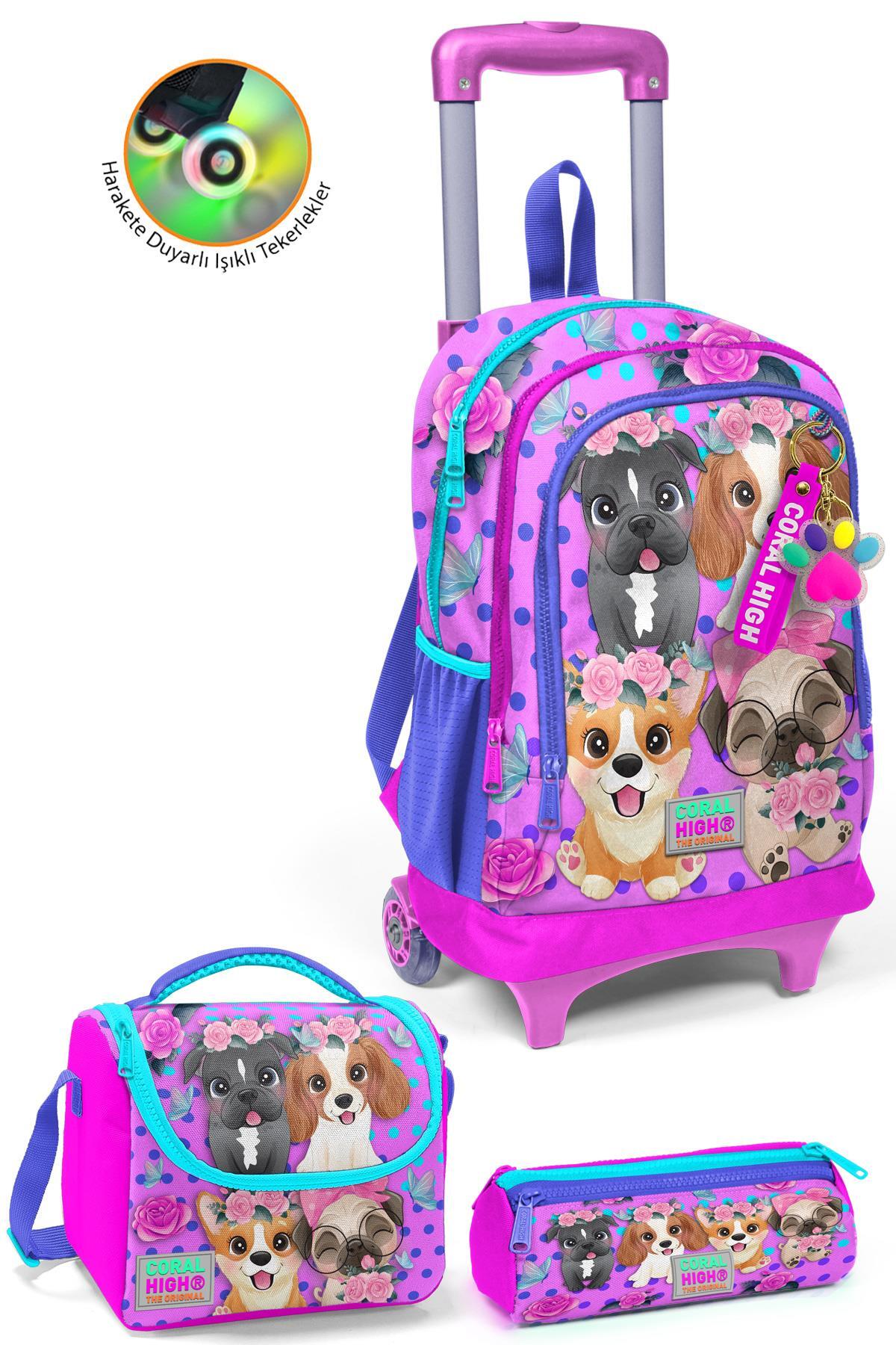 Coral High Kids Pembe Köpek Desenli Üç Bölmeli Çekçekli3'lü Çanta Seti SET0123950