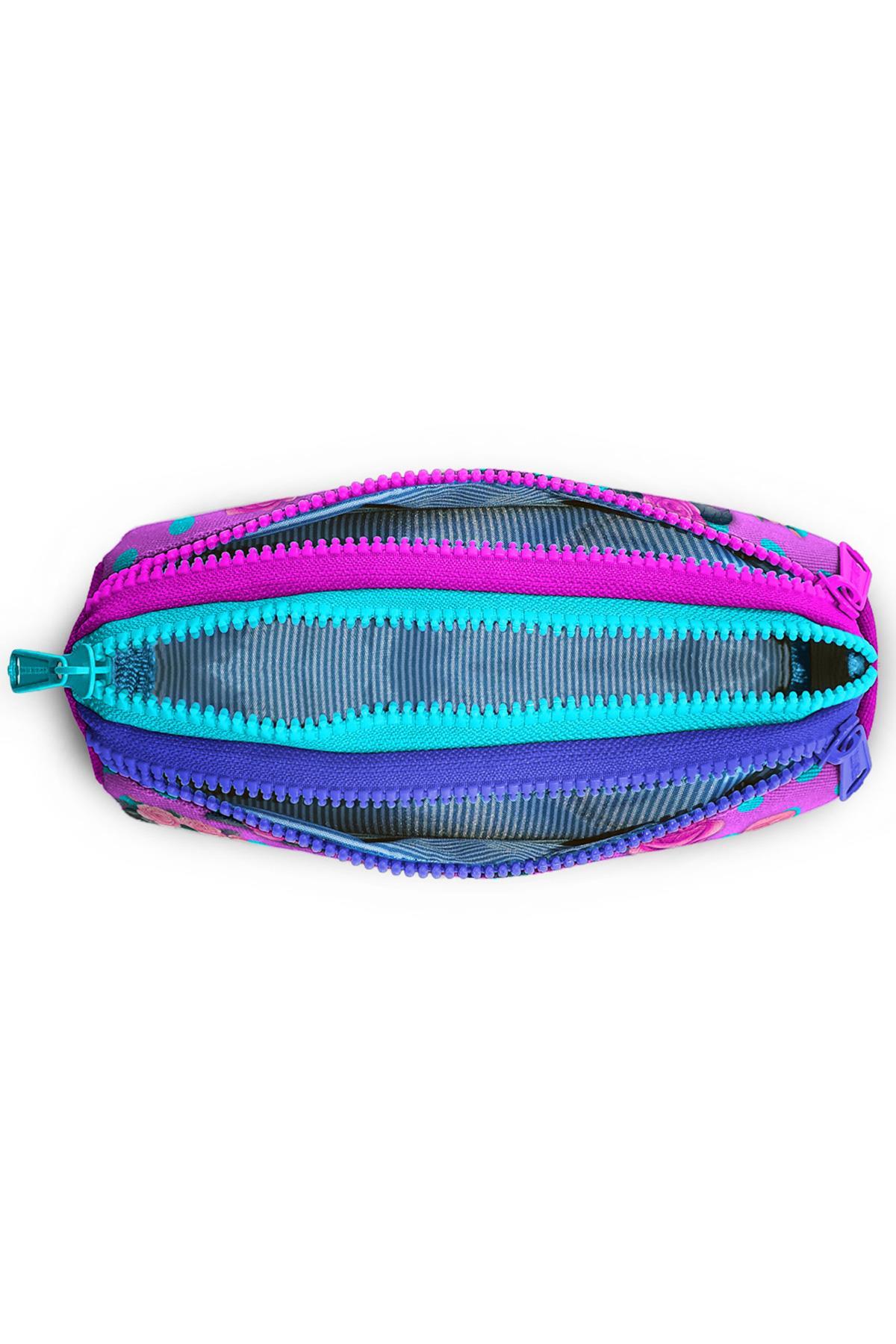 Üç bölmeli, fermuarlı kalem çantası.